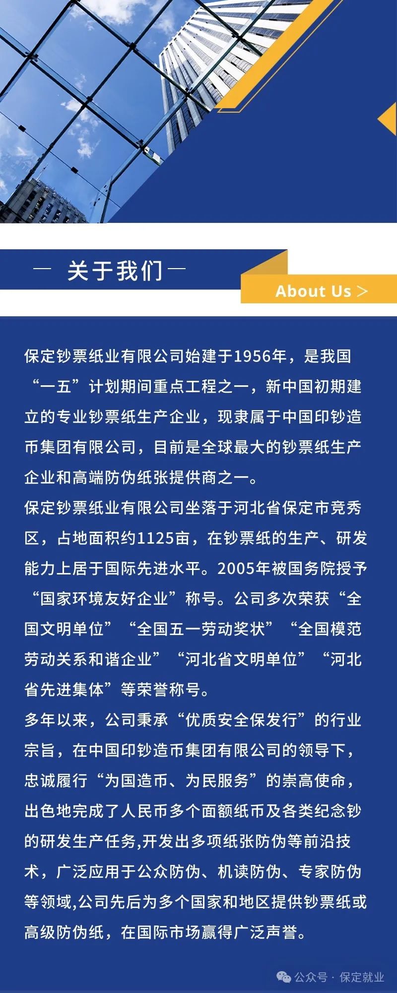 热忱欢迎有志于印制事业的莘莘学子到保定钞票纸业有限公司应聘,公司将为所聘人员搭建成长平台,真诚期待您的加入!