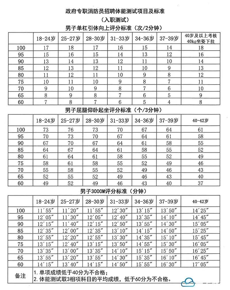 按照《政府专职消防员招聘体能测试项目及标准》(附件1、2)执行。