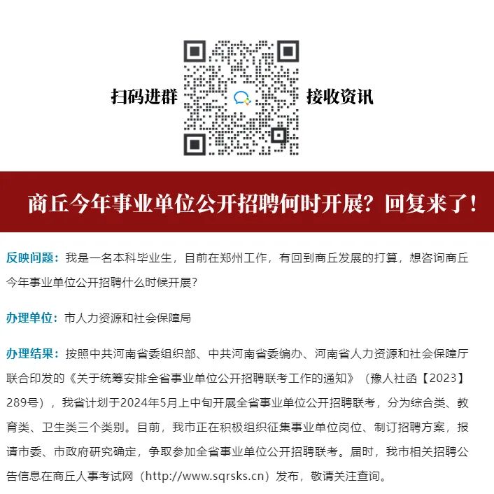 反映问题:我是一名本科毕业生,目前在郑州工作,有回到商丘发展的打算,想咨询商丘今年事业单位公开招聘什么时候开展?