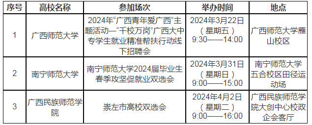 本次公开招聘拟采用校园招聘的形式进行,参加区内外部分高校招聘会、双选会的部分场次。主要参加场次、时间如下: