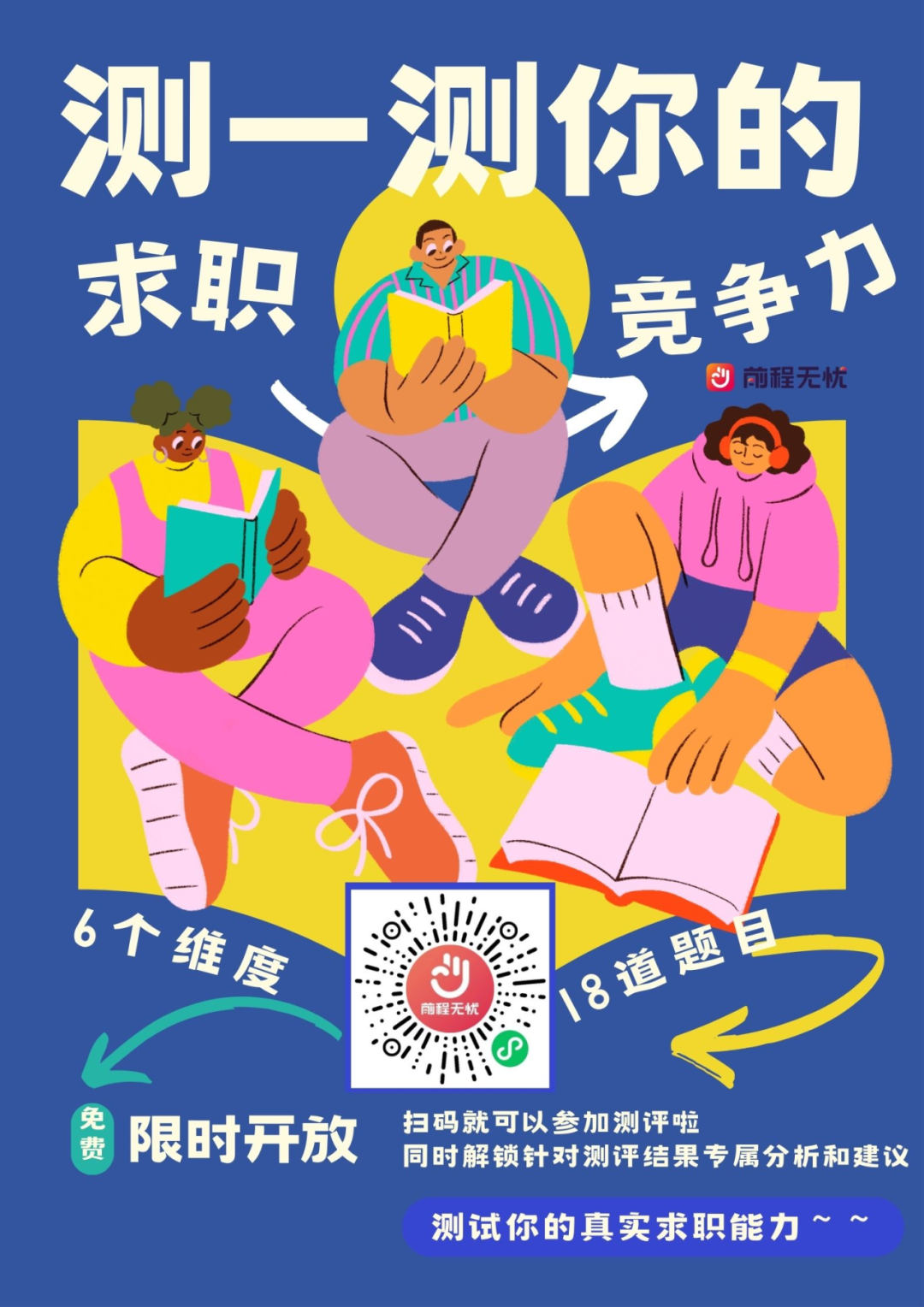 最好的最后,如果各位小伙伴们不太了解自身求职竞争力,我们也为大家准备了一份测评,6个维度18个题目,测试你的真实求职能力,了解你的春招竞争力。限时免费开放,扫码就可以参加测评啦,测评后还会有一份针对你的测评结果的专属分析和建议,可以说是非常贴心啦~