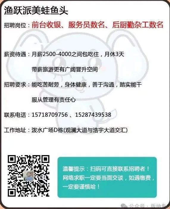 >【景洪招聘】包吃住 月薪:4000元 无学历要求 渔跃派美蛙鱼头招聘多个岗位~