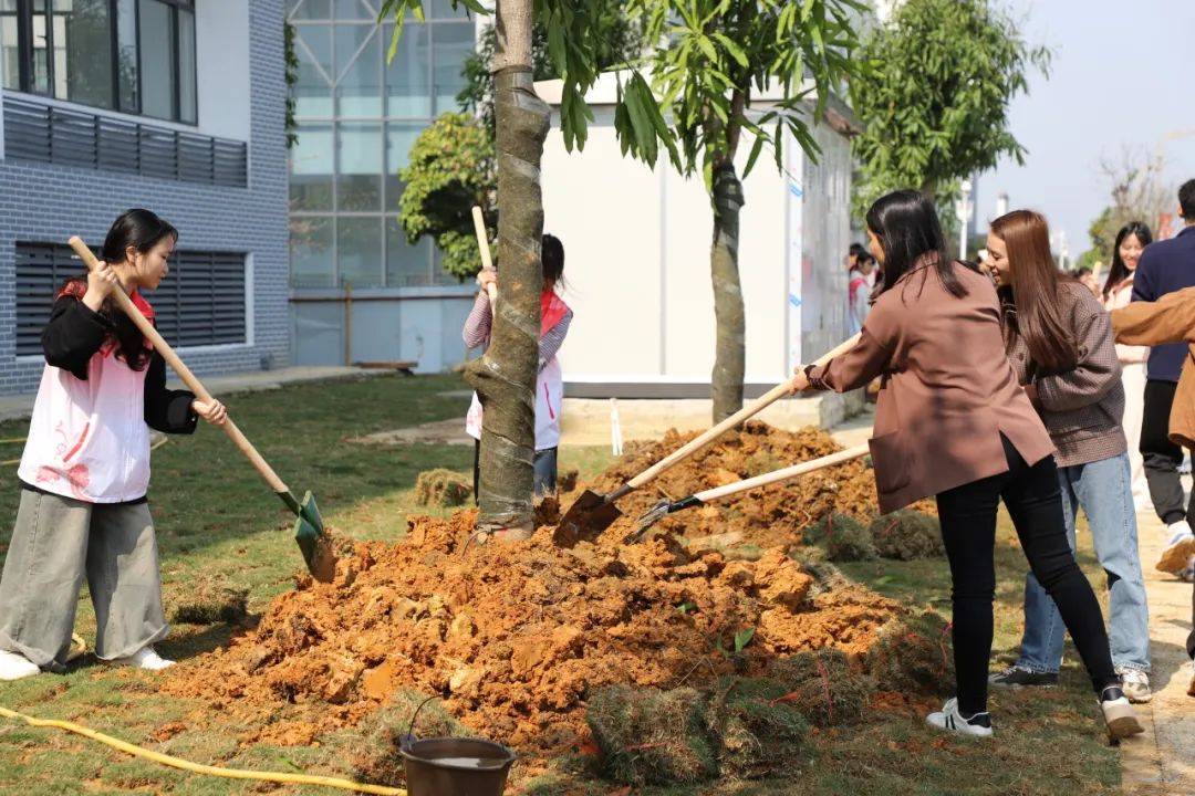学院领导与师生代表一起,在行政办公楼携手添种一片新绿。大家满怀热情地挥锹培土、浇水固苗……三五人一组,干劲十足,信心满满,耕植一方绿荫。