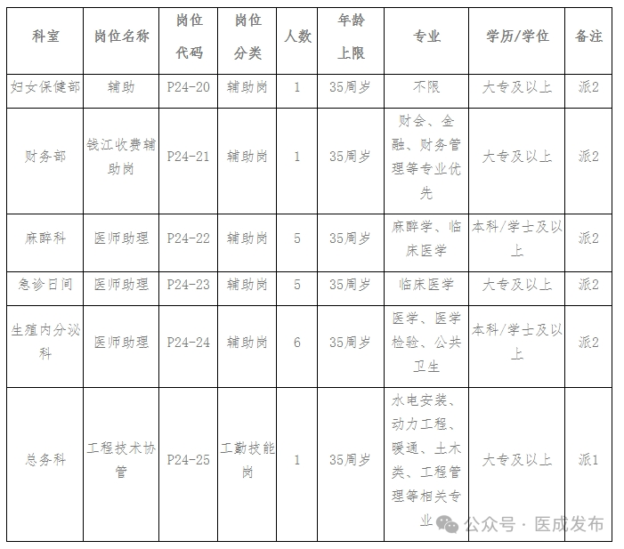 因工作需要,浙江大学医学院附属妇产科医院拟公开招聘劳务派遣人员19名,录用后与杭州江南人才服务有限公司签订劳务派遣合同,具体招聘岗位及条件如下: