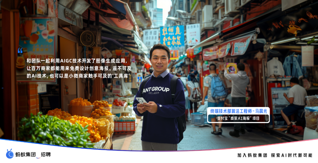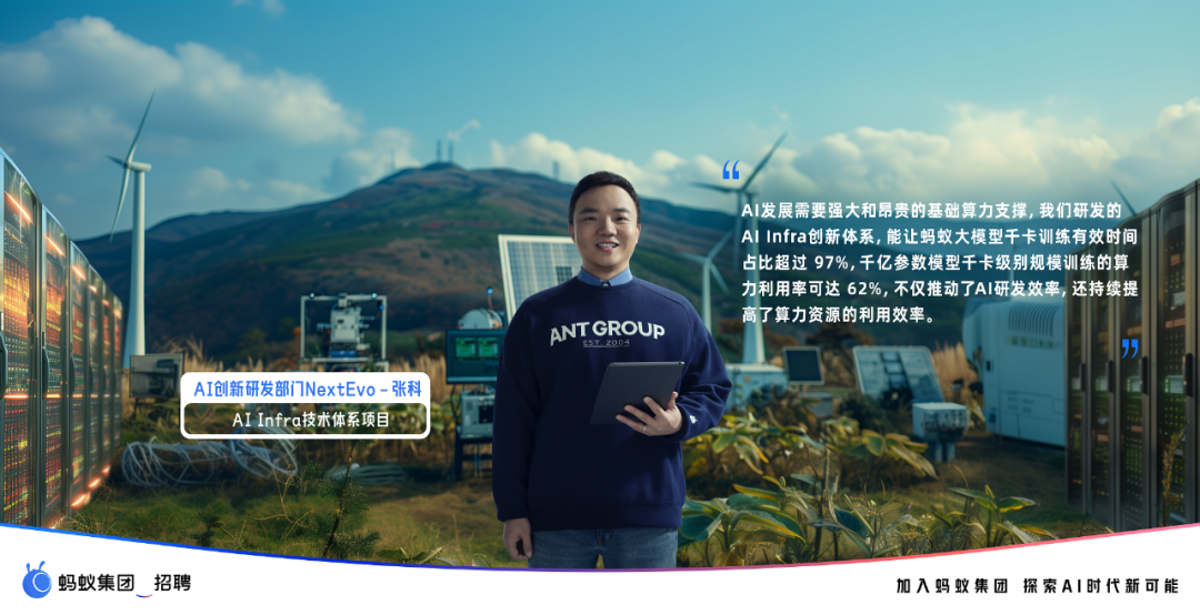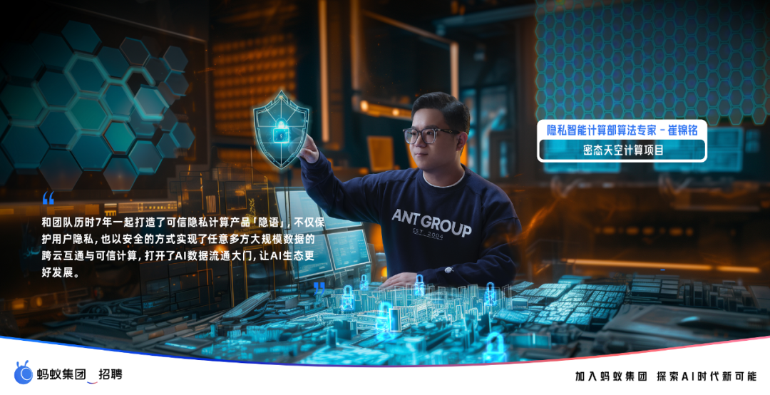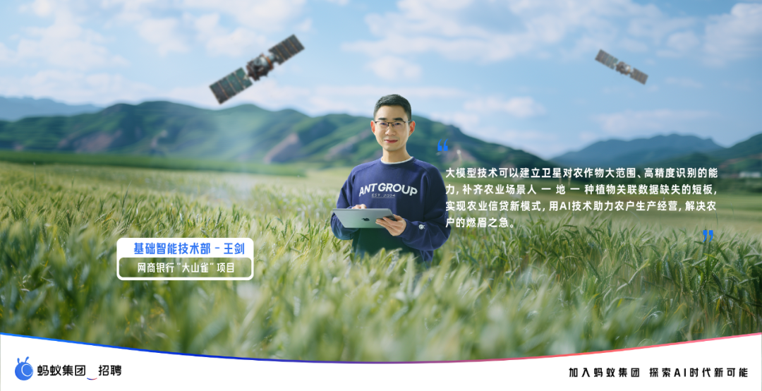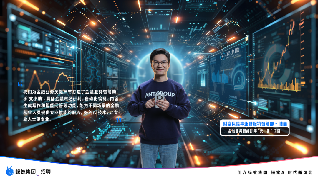 人工智能是新一轮科技革命的重要驱动力。今年春招,蚂蚁继续重揽人工智能、隐私计算、区块链等技术领域人才,开放 AI 类技术岗位包括算法工程、自然语言处理、机器学习、计算机视觉、AI 安全等。我们也请到 6 位专注 AI 应用的同事,希望用他们的探索故事,和同学们一起展望人工智能时代的无限可能。AI 发展需要强大和昂贵的基础算力支撑,蚂蚁 AI 精锐 NextEvo 研发的 AI Infra 体系项目,专注研发多云多芯异构硬件融合管理、在离线混合部署与自动化管理、云原生容器化与分时调度、持续性能监测与 AI 弹性容量四大核心技术,通过软硬件协同、算法与工程双提效,促进业务创新的同时构建绿色、高质量算力。在越发重视数据安全的今天,隐私计算是关键性“数据密态”技术。历时 7 年,崔锦铭和团队一起打造可信隐私计算产品「隐语」,不仅保护用户隐私,也以安全的方式实现了任意多方数据的跨云互通与可信计算。如今,「隐语」也通过开源的形式,将数据安全技术共享给了 ISV 及中小企业等,助力全行业数据流转,迈向“密态天空”。当 AI 走进田间地头,更大的价值正在释放。网商银行“大山雀”项目通过大模型和卫星遥感识别技术,建立了对农作物大范围、高精度识别的能力,补齐了农业场景人-地-种植物关联数据缺失的短板,实现了基于遥感智能解译的高效率、高精度农业信贷新模式,用 AI 技术助力农户生产经营。目前“大山雀”系统已覆盖 31 省、自治区、直辖市,服务超过 150 万种植户。支付宝推出的“创意海报 AI 版”,由蚂蚁 AIGC 技术产品画眉创意平台提供技术支持,其技术能力基于中文指令生成高清图像。除了支持文生图、图生图、inpainting、outpainting 等功能以外,平台还通过技术创新,实现免训练的参考图像风格、人像等视觉信息的精准提取,显著提升生成图像可控性,这也可以从需求侧多方面,满足大部分中小微商家快速上手、低门槛使用 AI 的诉求。亚运数字火炬手的首创,是希望让每个人都能参与传递亚运圣火,也能根据个人喜好,选择不同的五官、脸型和发型,创造出一个只属于自己的、独一无二的数字火炬手形象。为了实现亿级用户“一人一面”的数字化形象,支付宝技术团队通过人工智能、web3D 互动引擎等技术,从个性捏脸、动态捕捉到服装设计等,进行了许多探索。蚂蚁财富和保险技术团队,为蚂蚁百灵大模型在金融领域的实际落地展开了系列攻坚。其中研发的“支小助”的 1.0 版本包含了“服务专家版”“投研专家版”“理赔专家版”“保险研究专家版”等六个不同领域的 AI 助手,分别服务不同金融场景的从业人员。这些具备不同功能的 AI 助手可在投研分析、信息提取、专业创作、商机洞察、金融工具使用等环节提供深度智能服务。人才是蚂蚁最宝贵的财富,也是蚂蚁走向未来最坚实的力量。欢迎同学们加入蚂蚁,用科技和创新创造无限可能,更好地服务每一名消费者和每一家小微企业。如对求职信息有任何疑问