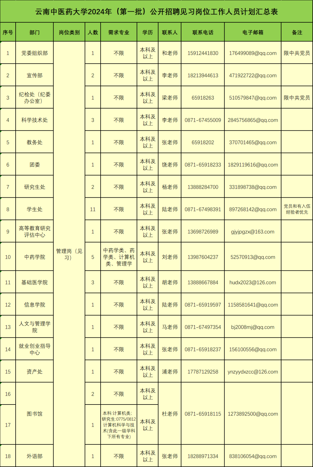 《云南中医药大学2024年(第一批)公开招聘见习岗位工作人员计划汇总表》