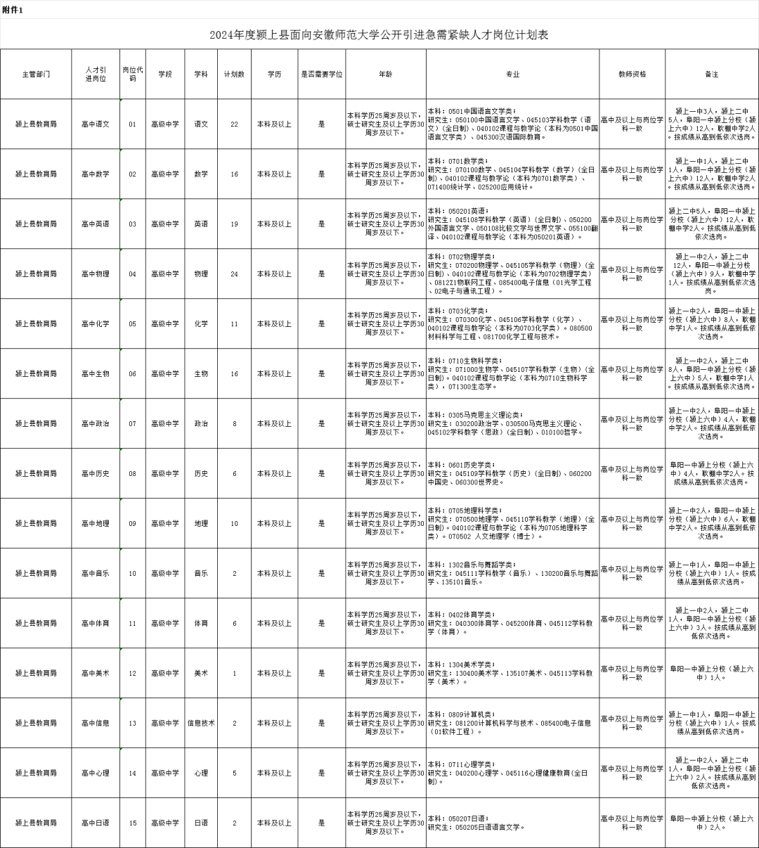 附件1:2024年度颍上县面向安徽师范大学公开引进急需紧缺人才岗位计划表
