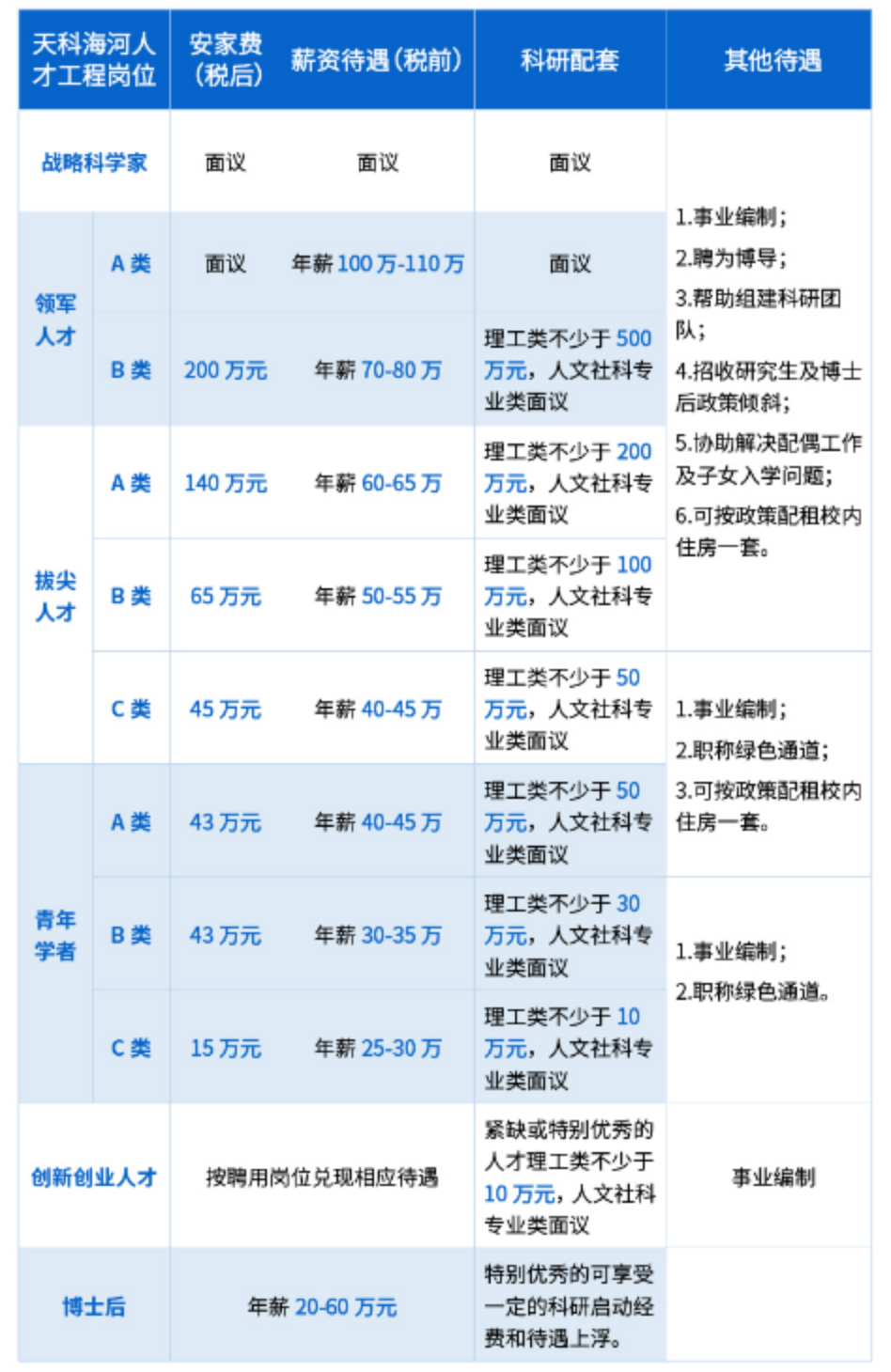 “天科海河人才计划”各类人才主要待遇