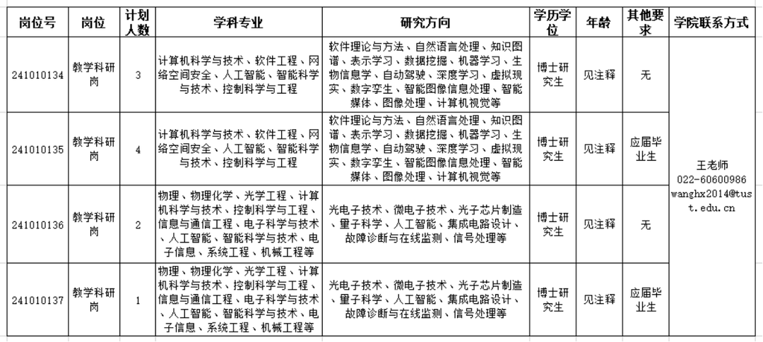 详见《天津科技大学2024年第一批公开招聘方案(博士或副高及以上岗位)》