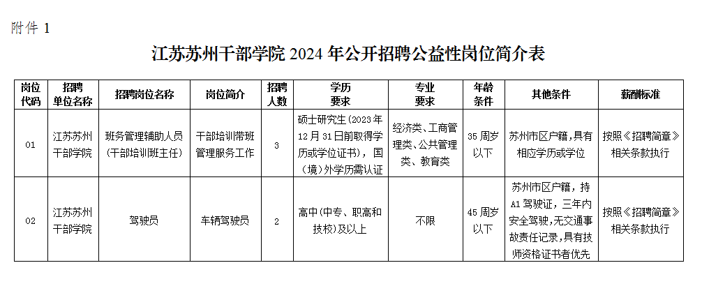 江苏苏州干部学院是苏州市委直属的全额拨款事业单位,归口苏州市委组织部管理。学院办学历史悠久,底蕴深厚,特色鲜明,坚持以习近平新时代中国特色社会主义思想为指导,牢记“为党育才,为党献策”初心,秉持“立足苏州、服务江苏、辐射全国”的办学理念,致力于展现中国式现代化苏州新实践,努力讲好发生在江苏、苏州的中国故事,为全国干部开展党性教育提供实践阵地和精神高地。现因工作需要,根据中共苏州市委办公室、苏州市人民政府办公室《印发〈关于进一步加强市级机关、事业单位公益性岗位用工管理的意见〉的通知》(苏委办发〔2019〕125号)和苏州市人力资源和社会保障局《关于印发〈苏州市机关事业单位公益性岗位用工招聘规程〉的通知》(苏人保事〔2010〕013号)的有关规定,经研究并报上级部门审批同意,拟面向社会公开招聘公益性岗位工作人员5名。现将有关事项公布如下:招聘岗位为:班务管理辅助人员3名、驾驶员2名。