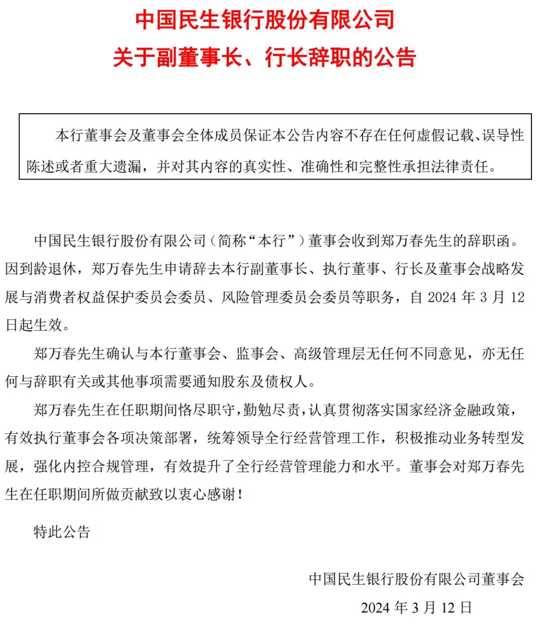 3月12日,民生银行(600016.SH)公告称,因到龄退休,郑万春申请辞去该行副董事长、执行董事、行长等职务,自2024年3月12日起生效。