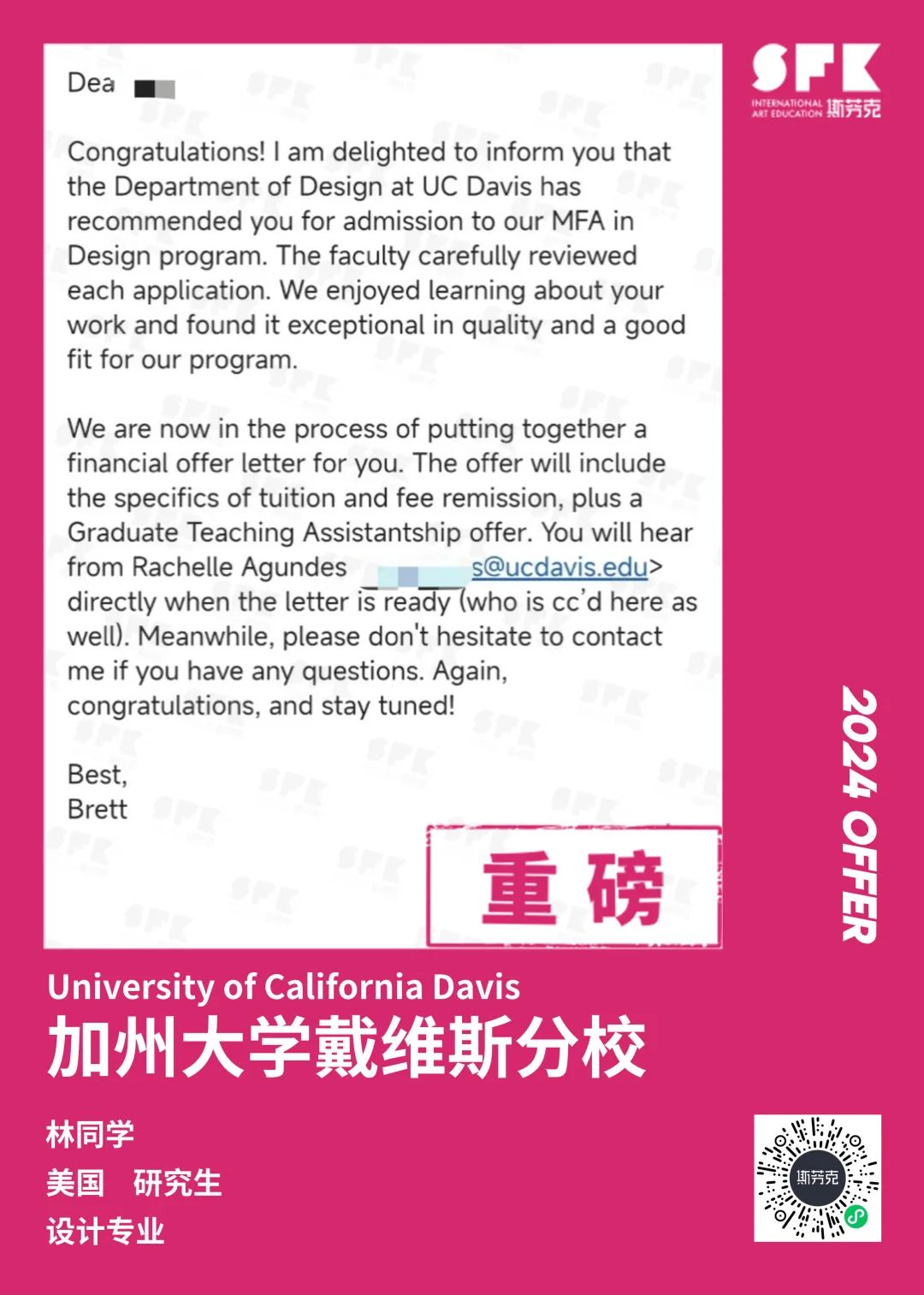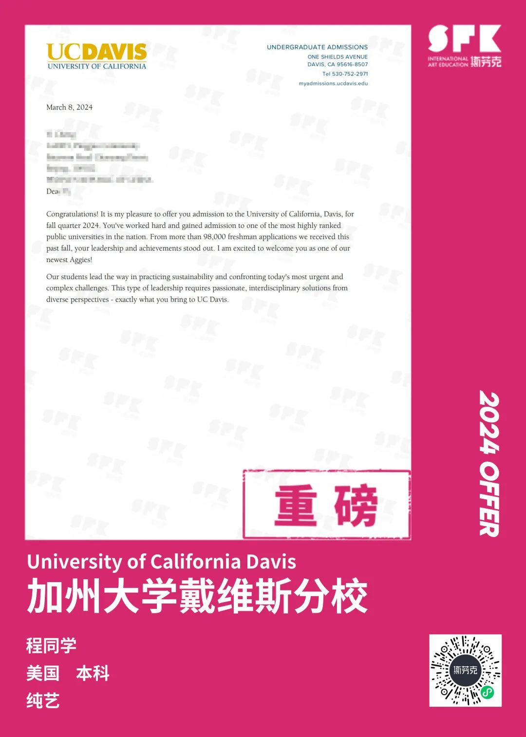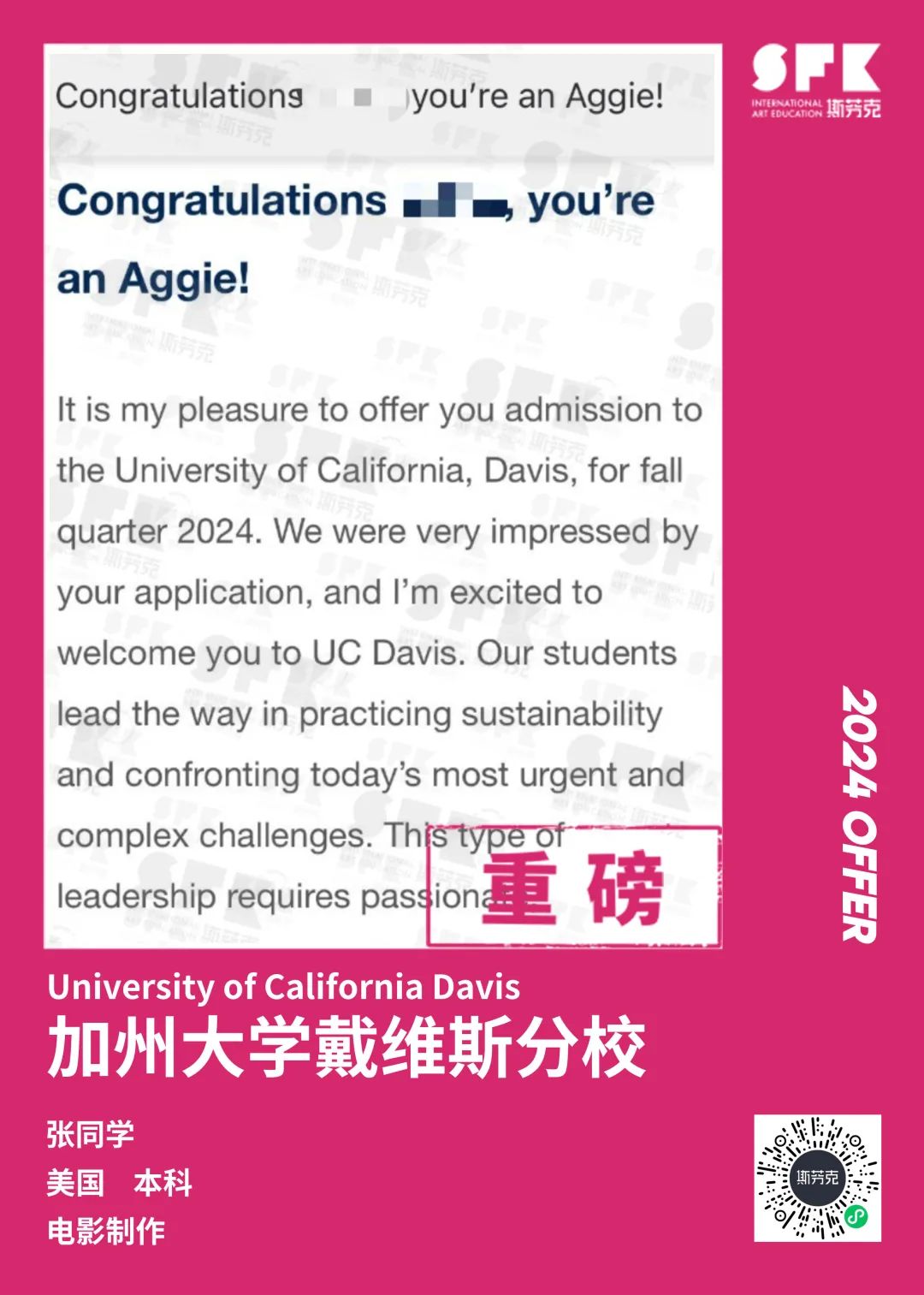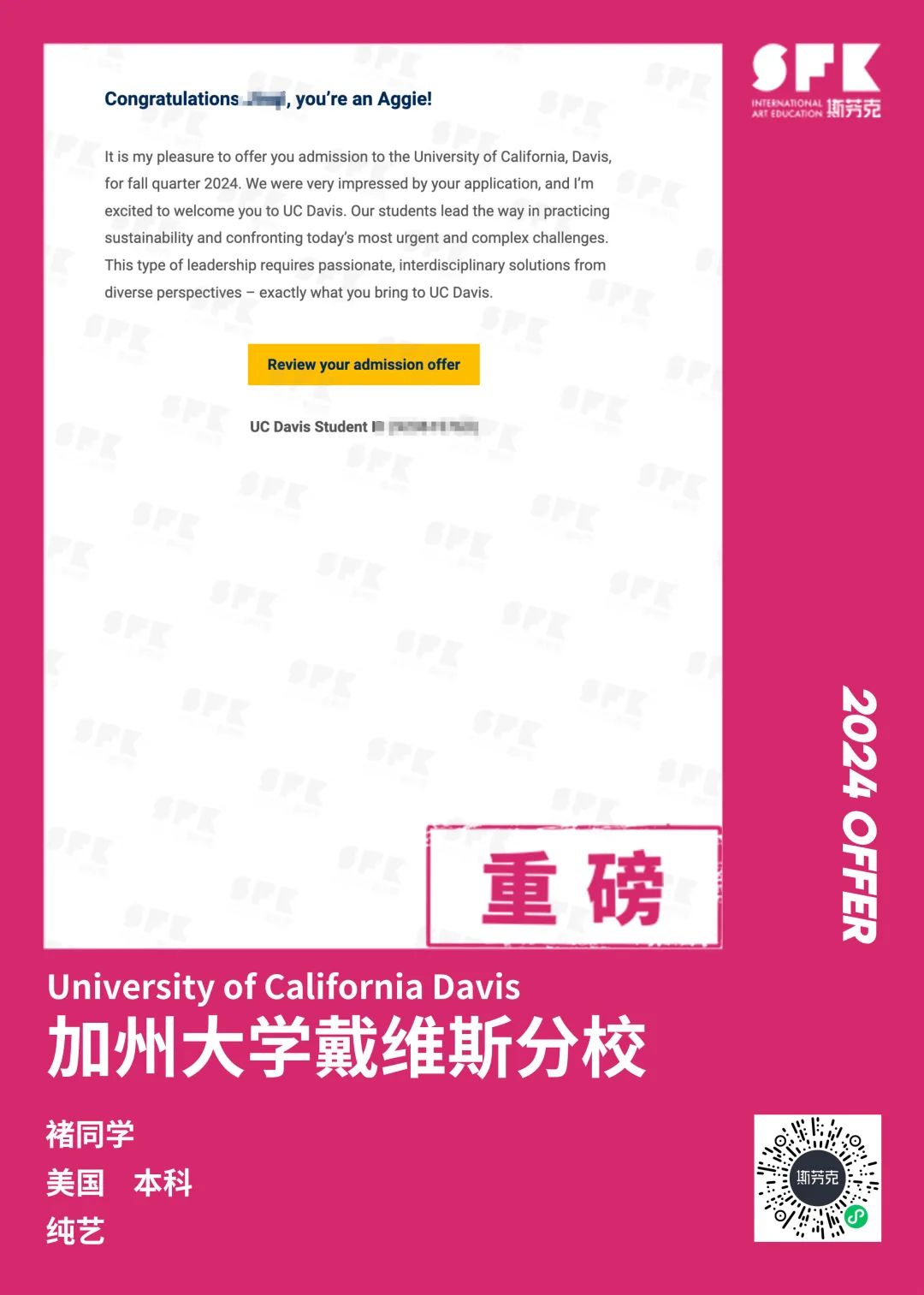 上周末迎来加州大学戴维斯分校、加州大学尔湾分校放榜,两所院校艺术设计相关专业非常丰富,斯芬克同学录取专业包含电影制作、纯艺(雕塑)、综合设计、音乐学等等。