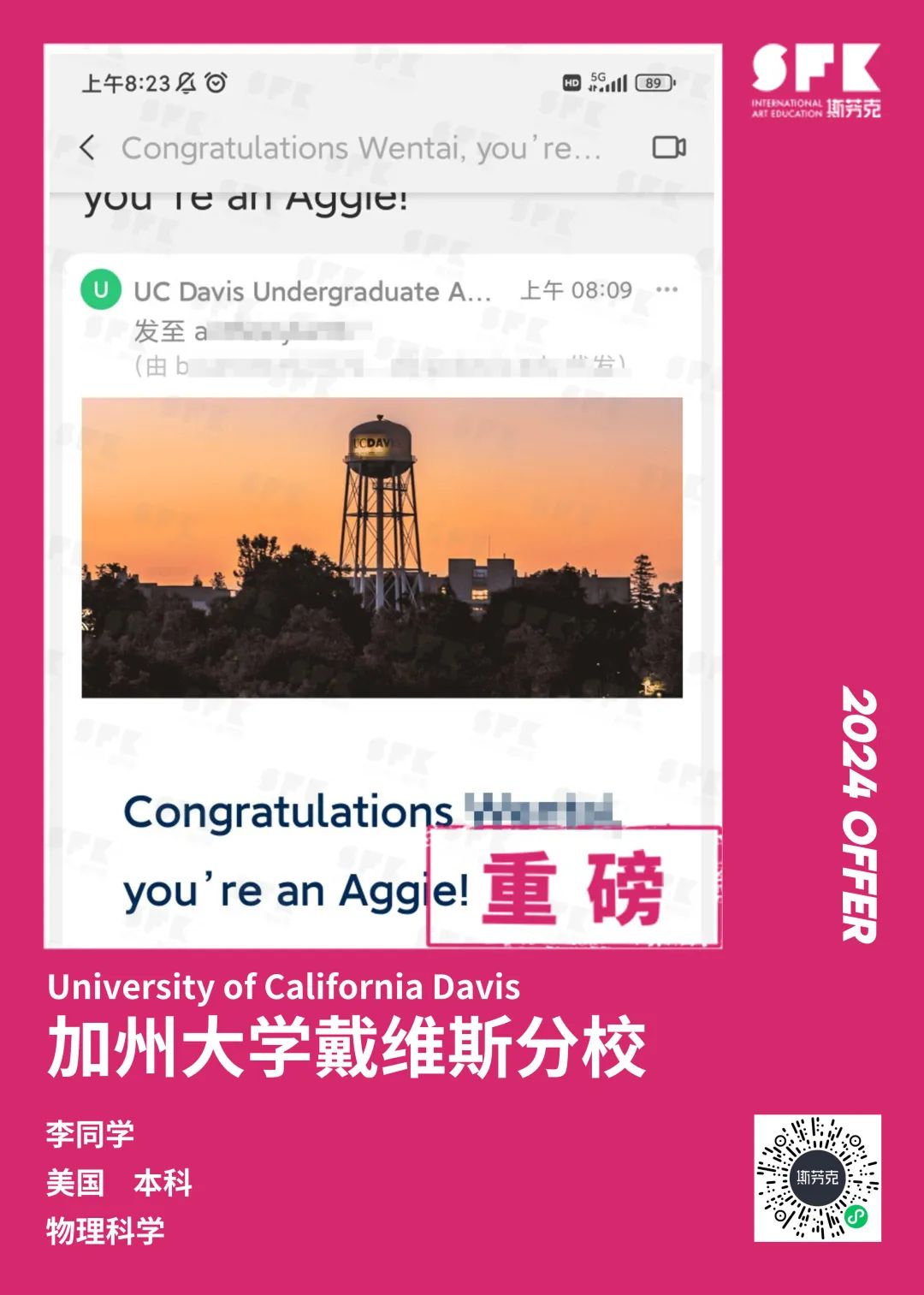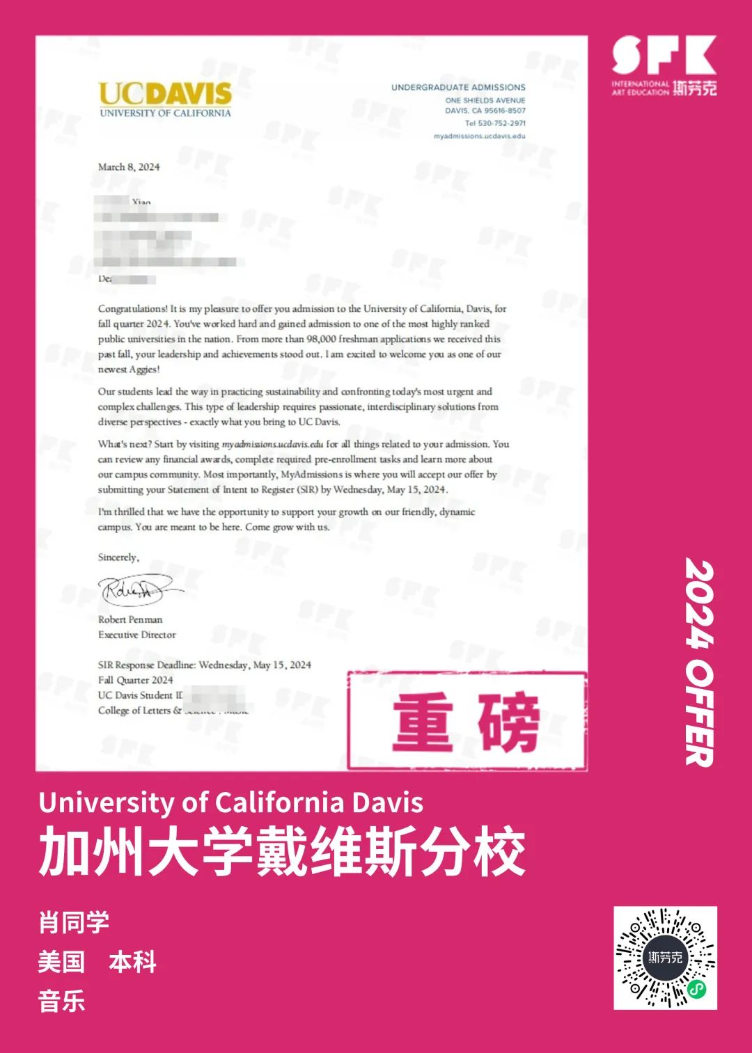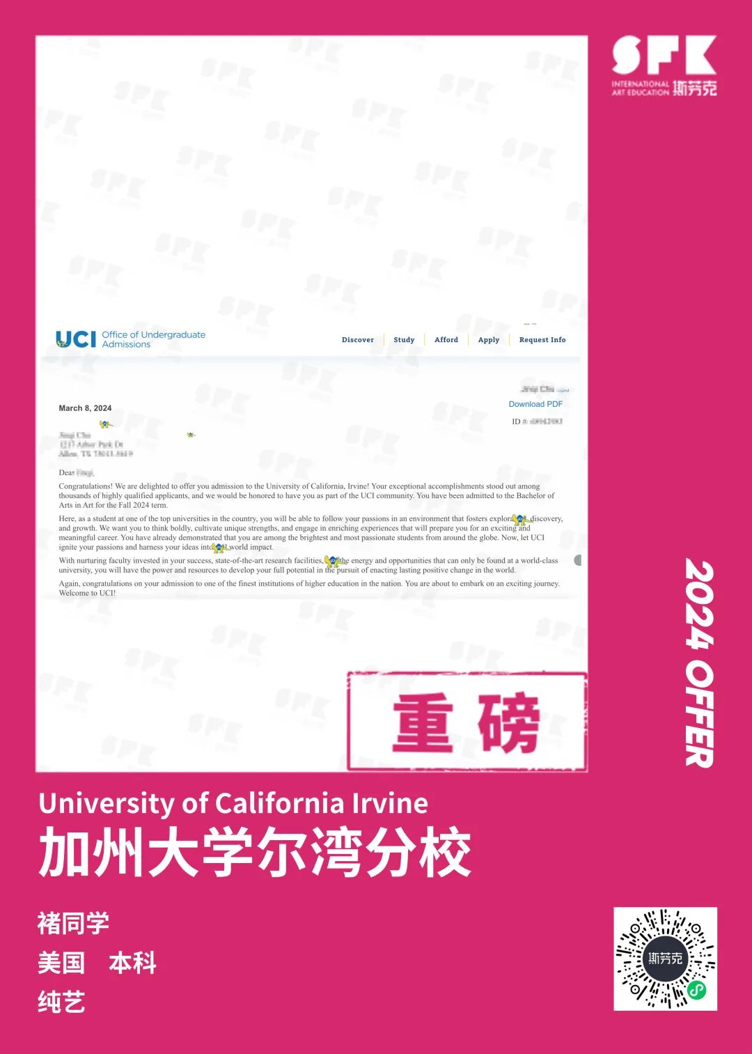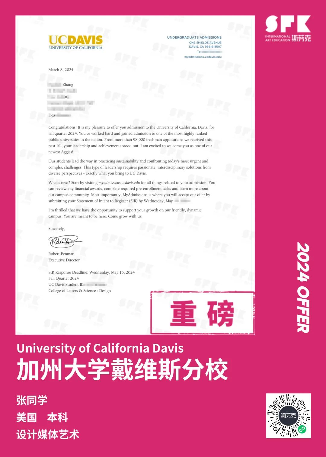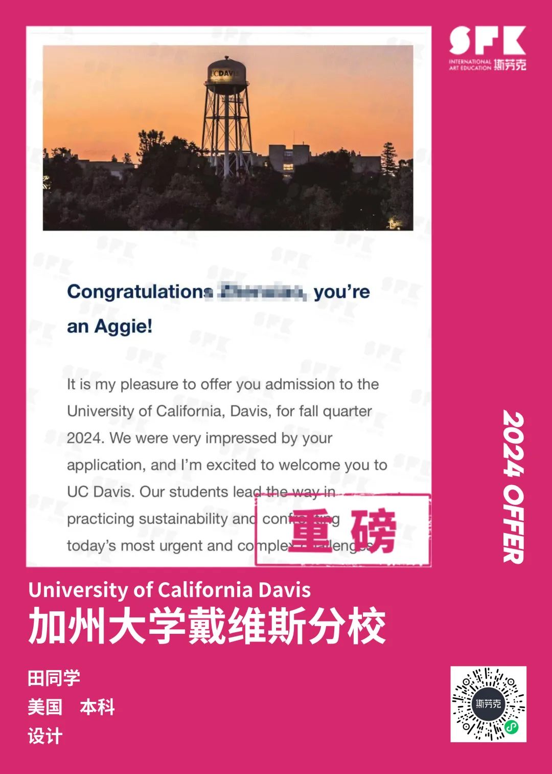 上周末迎来加州大学戴维斯分校、加州大学尔湾分校放榜,两所院校艺术设计相关专业非常丰富,斯芬克同学录取专业包含电影制作、纯艺(雕塑)、综合设计、音乐学等等。