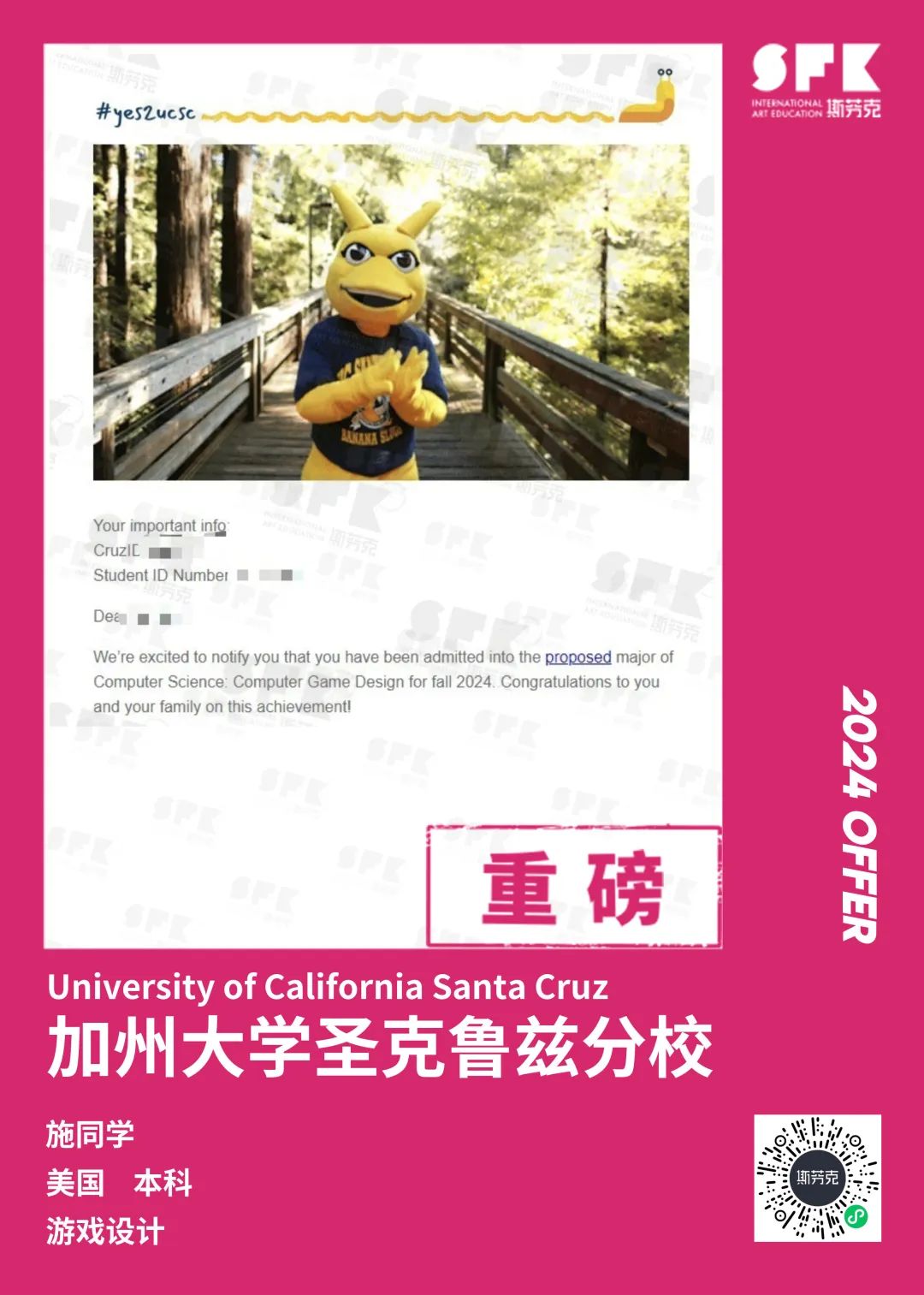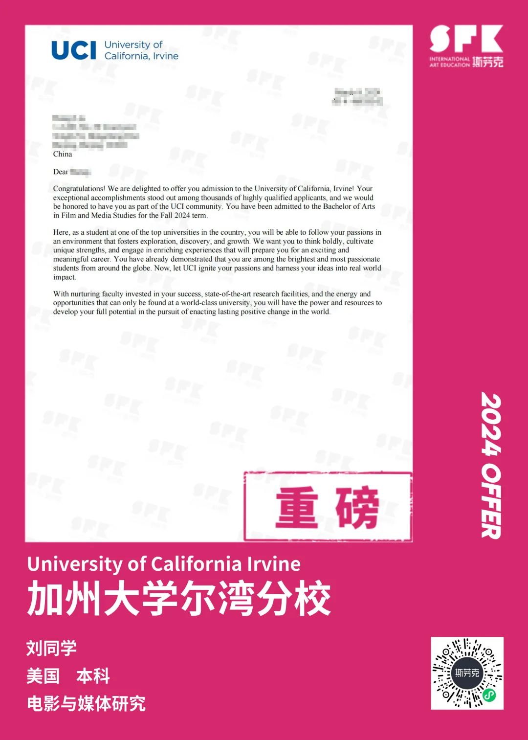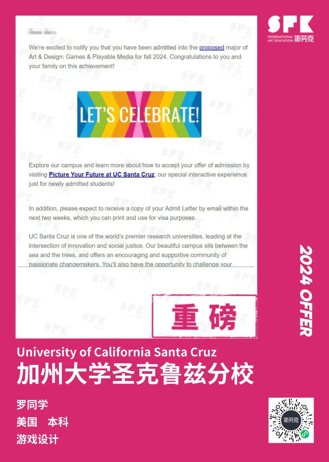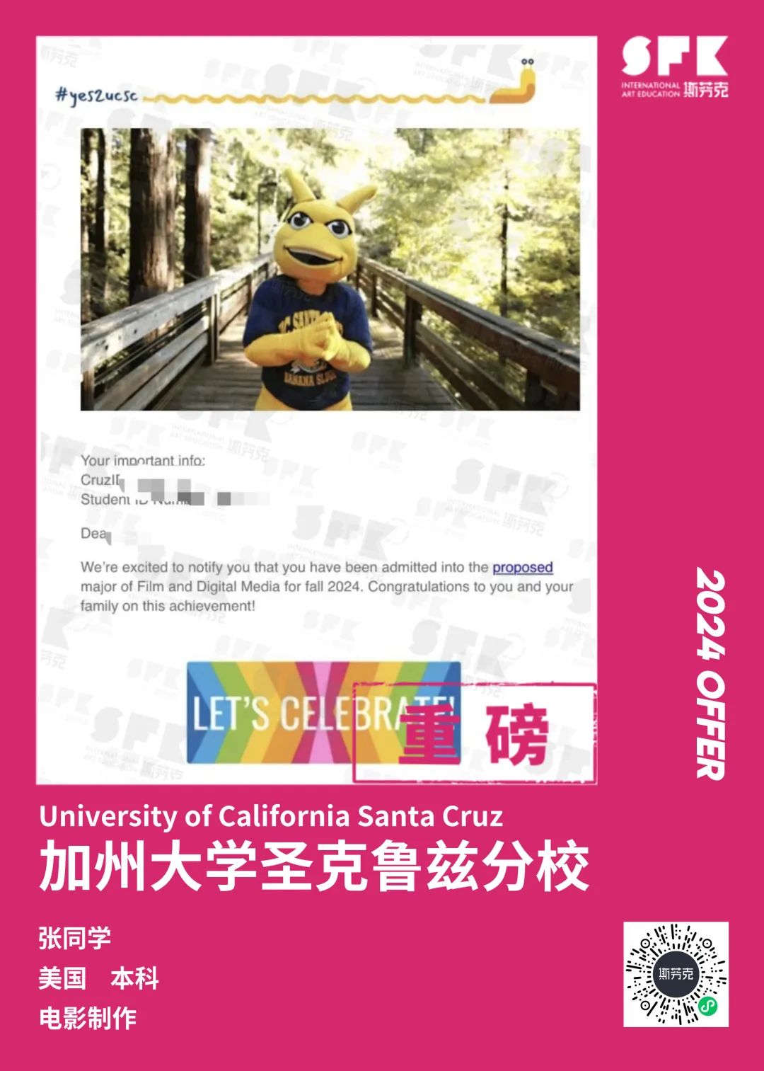 上周末迎来加州大学戴维斯分校、加州大学尔湾分校放榜,两所院校艺术设计相关专业非常丰富,斯芬克同学录取专业包含电影制作、纯艺(雕塑)、综合设计、音乐学等等。