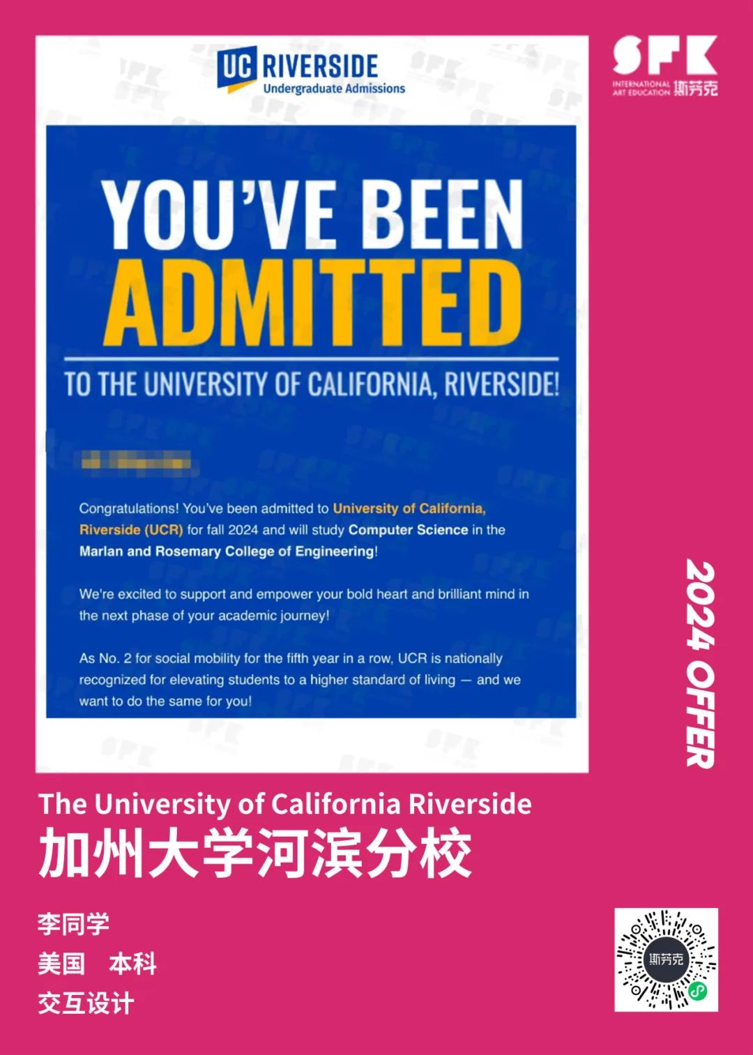 特别在本科录取中,学生高中背景多元,有知名国际高中、重点高中国际部,也有普通高中与中专。同学们在艺术与设计作品集和背景活动上的深耕以及相互强关联,让不同背景的同学都能获得知名公立大学的青睐。
