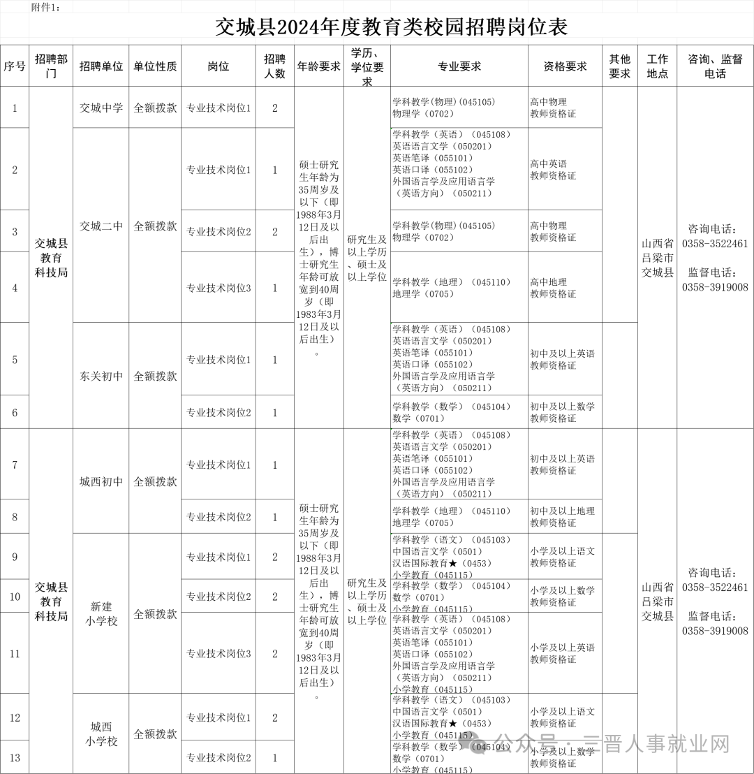为进一步加强交城县教师队伍建设,根据《事业单位人事管理条例》、《关于做好2024年全省事业单位公开招聘工作的通知》(晋人社厅发【2023】88号)等政策规定和《交城县2024年度教育类校园招聘实施方案》,现将交城县教育类校园招聘事项公告如下:(三)坚持政府宏观管理与落实用人单位自主权相结合;符合本次校园招聘条件和岗位所需具体要求的2024年应届高校毕业生(不含委培、定向生)。(六)应届硕士研究生年龄35周岁及以下(1988年3月12日及以后出生),应届博士研究生年龄可放宽到40周岁及以下(1983年3月12日及以后出生);(七)2024年应届毕业生,需在2024年8月31日前取得相应的学历和学位证书。(八)按照国家和我省有关政策规定,港澳地区的中国公民和台湾同胞在事业单位公开招聘中享有公平竞争权利,可应聘到内地事业单位就业,应聘人员须具备招聘岗位所需的专业或技能等相应条件。1.现役军人和在读的非应届毕业生(其中,非2024年应届毕业的研究生不得以原取得的硕士研究生学历、学位证书报名),不能报考;2.因犯罪受过刑事处罚的、被开除中国共产党党籍和公职的;在立案审查期间或未解除党纪、政纪处分的人员,不能报考;3.各级公务员招考和事业单位招聘中被认定有舞弊等严重违反考录、招聘纪律行为的人员,不能报考;4.试用期内的公务员(参照公务员法管理事业单位工作人员)和试用期内的事业单位工作人员,不能报考;5.招聘、录用为事业单位工作人员、公务员有服务年限规定且服务期未满的,所在单位不同意报考的,不能报名;6.被依法列为失信联合惩戒对象以及法律、法规规定不符合本次公开招聘要求的人员,不能报考。应聘者在报名之后、聘用之前已成为试用期内的公务员(参照管理单位工作人员)或已被聘用为事业单位工作人员的,不予聘用。招聘条件或岗位要求的辞退、现役、试(聘)用期、服务期、各类从业(职业、执业)资格证书等的截止时间,除岗位有明确要求外,均为公告发布之日。交城县2024年度教育类校园招聘岗位19个,岗位所需的具体条件以《交城县2024年度教育类校园招聘岗位表》(以下简称《岗位表》)的要求为准。本次校园招聘岗位实际报名人数与岗位招聘人数不足5:1时,通过面试方式确定引进人选;超过5:1 (含5:1)时采取笔试与面试相结合的办法确定引进人选。本次招聘在太原师范学院设置招聘主会场,实行现场报名,现场报名时间如下:每日上午8:30-12:00 下午3:00-6:00报考人员须在规定时间、规定地点,提交《交城县2024年度教育类校园招聘报名登记表》(以下简称《报名登记表》)。报考人员只能选择一个岗位进行报名,报名与考试时使用的本人有效居民身份证必须一致。报名时,报考人员须认真填写《报名登记表》并签订诚信承诺书,确保提交的报名信息真实、准确、完整(《报名登记表》中所填写的专业应当与报考者本人取得高校毕业证上所载明的专业一致。如毕业学校按照一级学科发放毕业证的,须如实填写毕业证所载一级学科名称,《报名登记表》“备注”栏中写明所学具体专业;取得国(境)外学历学位的报考人员须在《报名登记表》“备注”栏中写明所学核心课程和毕业论文题目,并由交城县2024年教育类校园招聘工作领导小组组织5名本专业或相近专业专家对其专业是否符合岗位要求进行认定)。提供虚假报名信息的,一经查实,立即取消报考资格。对伪造、变造有关证件、材料、信息骗取考试资格的,将按《事业单位公开招聘违纪违规行为处理规定》(人社部35号令)予以严肃处理。凡因信息填报有误、不全等导致未通过资格审查的,后果由报名者自负。资格审查由交城县2024年度教育类校园招聘工作领导组办公室负责组织实施。(1)《报名登记表》(一式三份,照片需本人近一年内2寸红底免冠正面照,并在本人承诺部分签字);(2)本人有效居民身份证、户口簿(首页及本人页)原件及复印件(一式三份);(5)通过学信网下载的《教育部学历证书电子注册备案表》学历证明及《中国高等教育学位在线验证报告》学位证明;留学人员应提供教育部留学服务中心出具的国(境)外学历、学位认证书;(6)毕业院校按照一级学科发放毕业证的,需提供学校出具的专业证明及在校成绩单原件及复印件。(7)审查时暂未取得相应学历和学位证书的2024年应届毕业生,需提供所在学院或学校出具的学历学位证明,说明入学及毕业时间、所学专业、是否可如期毕业及按期取得学历、学位证书,并在2024年8月31日前取得相应的学历和学位证书;提供通过学信网下载的《教育部学籍证书电子注册备案表》。证件(证明)不全或所提供的证件(证明)与所报岗位资格条件不符以及主要信息不实,影响资格审查的,取消该报考人员参加考试资格。报考人员未按规定时间、地点参加资格审查的,视为自动放弃考试资格。资格审查贯穿本次校园招聘工作全过程,在任何环节发现不符合岗位报名要求的考生,立即取消其考试资格。实际报名人数不达岗位招聘人数的岗位,按1:1核减岗位招聘人数,如减少到1个仍无人报考,原则上予以取消。岗位被核减、取消或调整的,经核准后在原发布校园招聘公告的网站发布通知。报考人员在报名结束后,可于指定时间登录网站自行下载打印《笔试准考证》。下载打印过程中如遇问题请与交城县2024年度教育类校园招聘工作领导组办公室联系解决