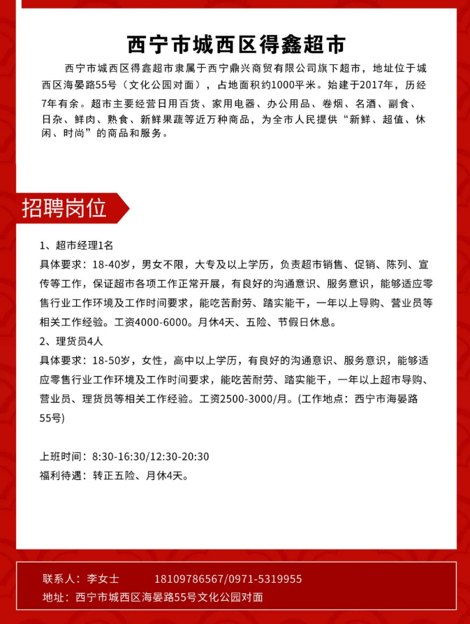 >西宁市城西区得鑫超市招聘信息