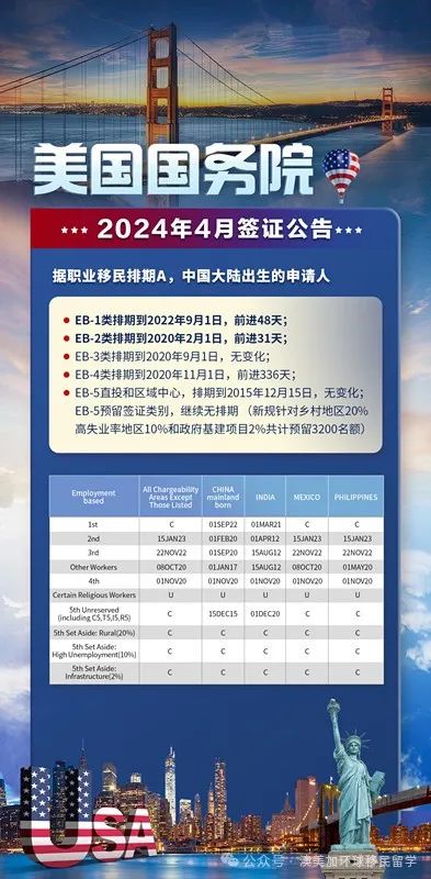 近日美国国务院更新了2024年4月的各类移民排期中国申请人常用的类别中,只有EB-1、EB-2、婚姻绿卡小幅前进。预测:未来几个月职业移民、和亲属移民各类别多数会保持本月公布的日期、或只会出现小幅前进。美国移民排期