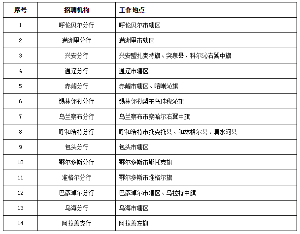 3.大学生村官及“三支一扶”人员专项报名通道主要面向以下机构开放:兴安分行扎赉特支行、兴安分行突泉支行、兴安分行科尔沁右翼中旗支行、赤峰分行喀喇沁旗支行、锡林郭勒分行乌珠穆沁支行、乌兰察布分行察哈尔右翼中旗支行、呼和浩特分行托克托县支行、呼和浩特分行和林格尔新区支行、呼和浩特分行清水河支行、鄂尔多斯分行棋盘井工业园区支行、巴彦淖尔分行乌拉特中旗支行。