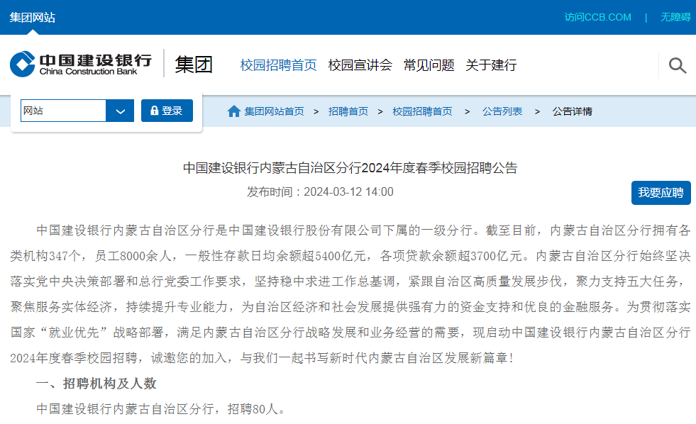 中国建设银行内蒙古自治区分行是中国建设银行股份有限公司下属的一级分行。截至目前,内蒙古自治区分行拥有各类机构347个,员工8000余人,一般性存款日均余额超5400亿元,各项贷款余额超3700亿元。内蒙古自治区分行始终坚决落实党中央决策部署和总行党委工作要求,坚持稳中求进工作总基调,紧跟自治区高质量发展步伐,聚力支持五大任务,聚焦服务实体经济,持续提升专业能力,为自治区经济和社会发展提供强有力的资金支持和优良的金融服务。为贯彻落实国家“就业优先”战略部署,满足内蒙古自治区分行战略发展和业务经营的需要,现启动中国建设银行内蒙古自治区分行2024年度春季校园招聘,诚邀您的加入,与我们一起书写新时代内蒙古自治区发展新篇章!