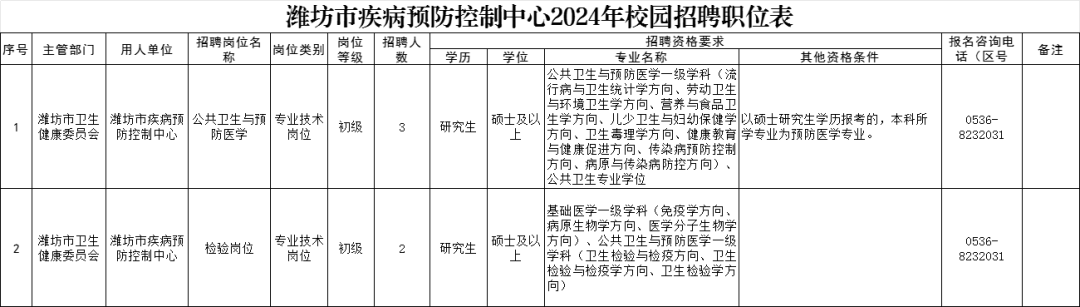 根据《事业单位人事管理条例》(国务院令第652号)、《事业单位公开招聘人员暂行规定》(人事部令第6号)、《山东省事业单位公开招聘人员实施办法》(鲁人社规〔2022〕2号)、《2024年市卫健委直属单位公开招聘工作总体方案》等文件规定,现将2024年潍坊市疾病预防控制中心校园招聘工作人员有关事项公告如下: