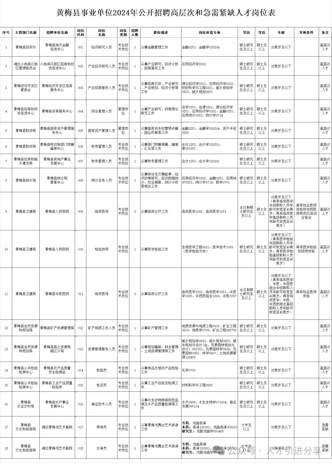 1.黄梅县事业单位2024年公开招聘高层次和急需紧缺人才岗位表