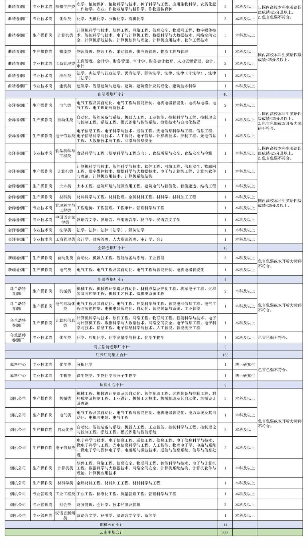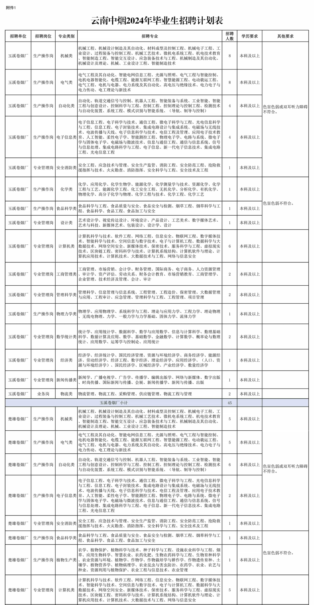 云南中烟2024年计划招聘毕业生333人,具体招聘单位、人数及相关要求详见《云南中烟2024年毕业生招聘计划表》(附件1)。