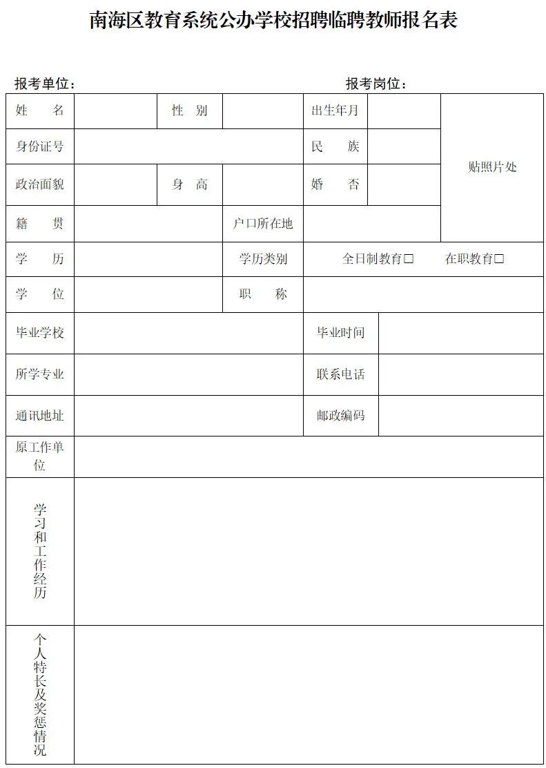 (或把个人简历及《南海区教育系统公办学校招聘临聘教师报名表》(附件1)投递到邮箱289758573@qq.com,投递成功者视同报名)