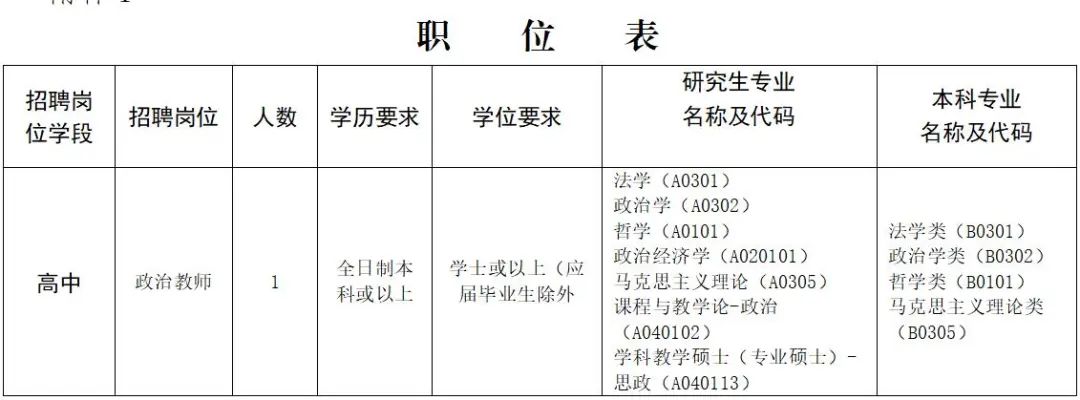 本次招聘临聘教师岗位1个(政治教师1人),具体招聘岗位见职位表(附件1)。