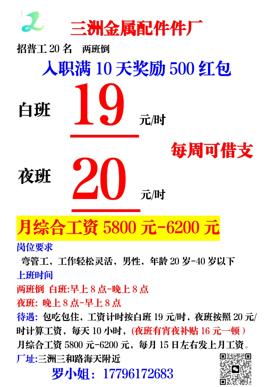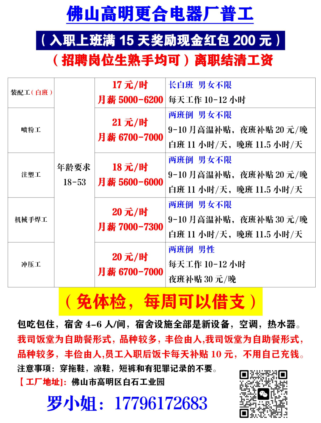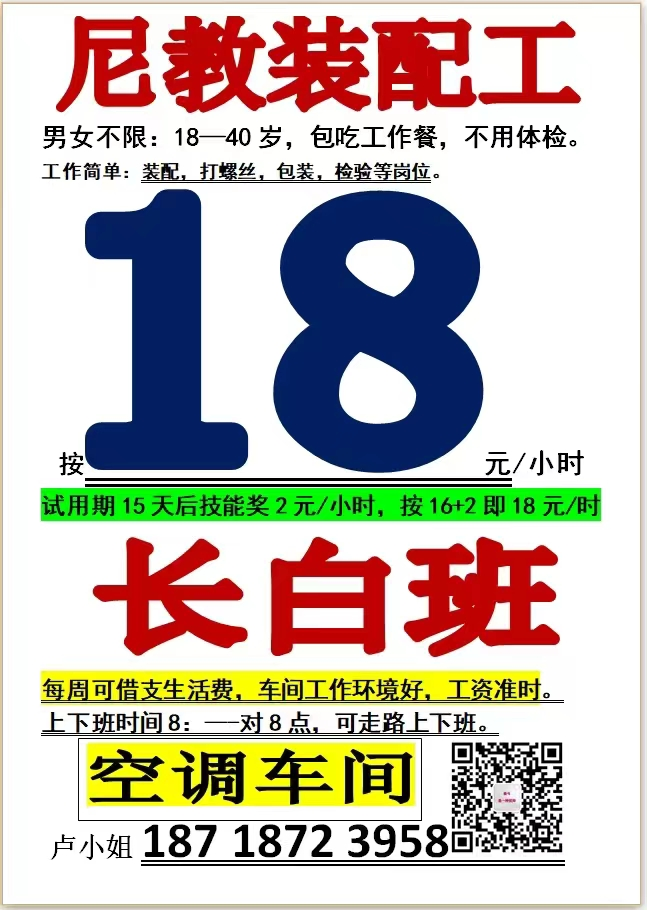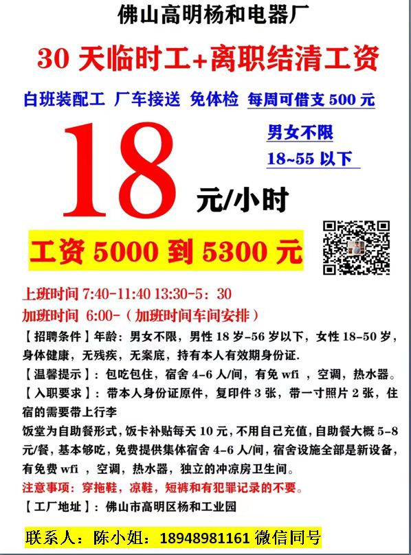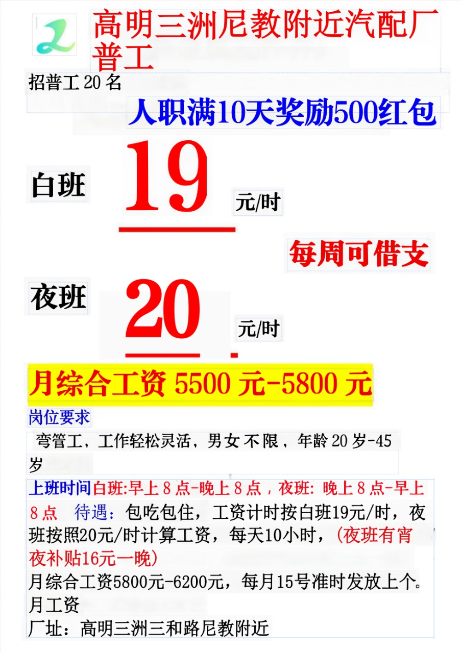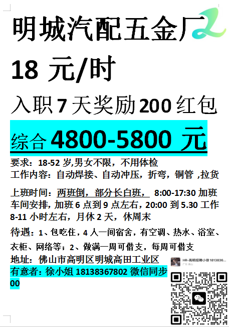 要求:性别不限,18-455300-6200/月能接受偶尔上夜班,白班10小时/天,夜班8小时/天,夜班补贴55元/天,计时+集体计件。