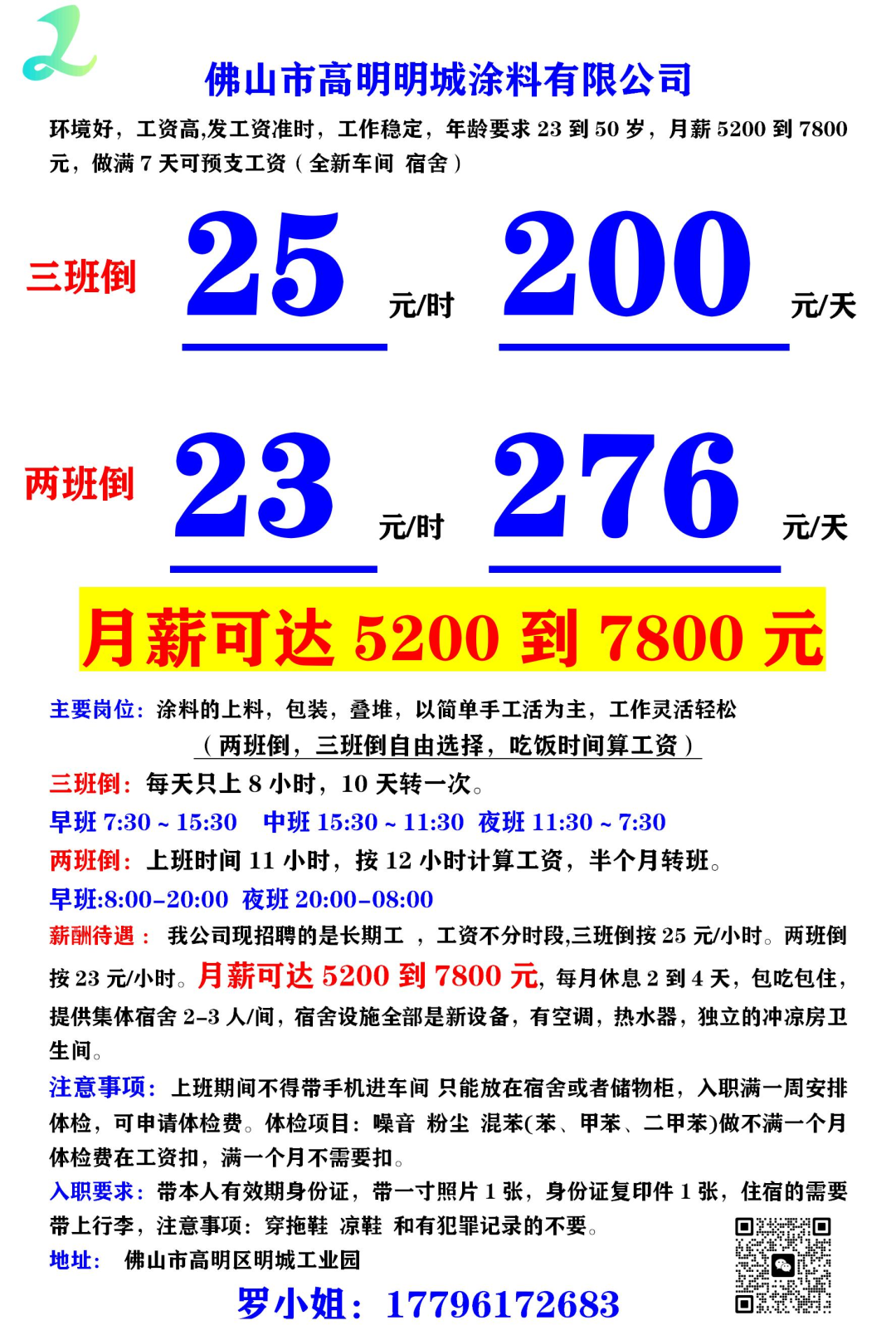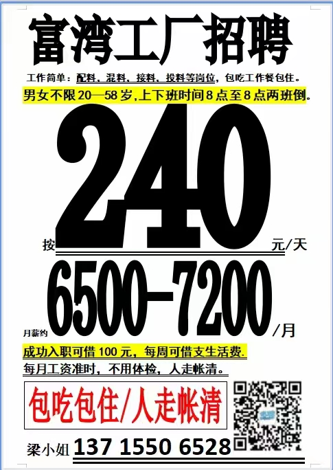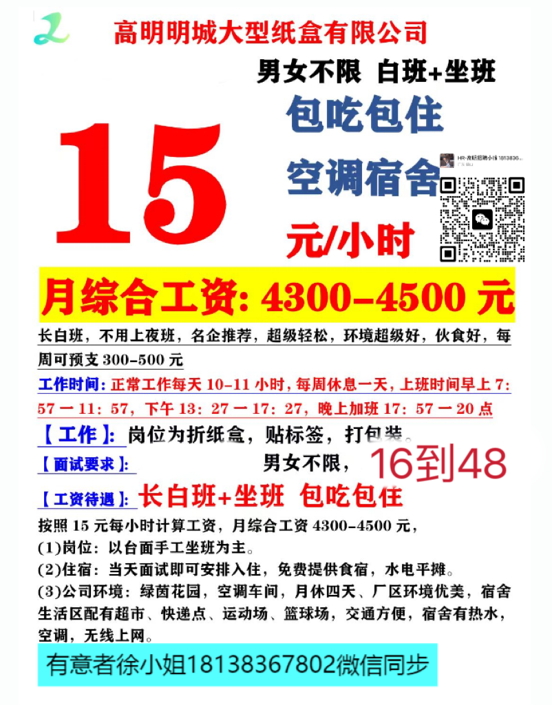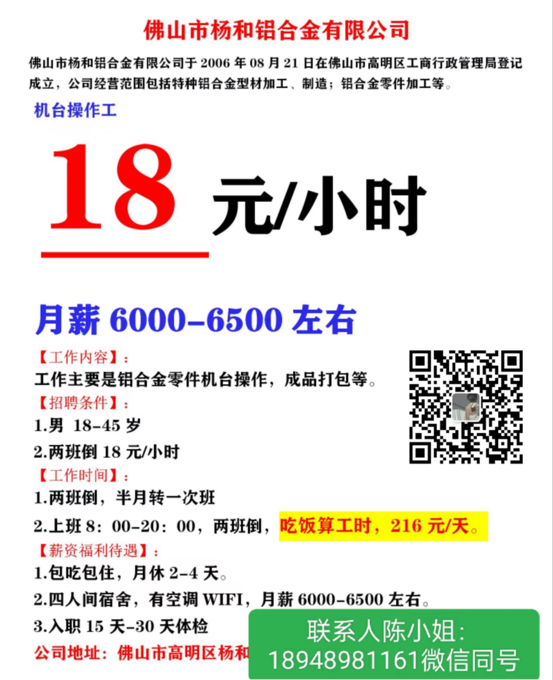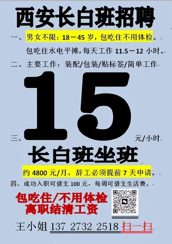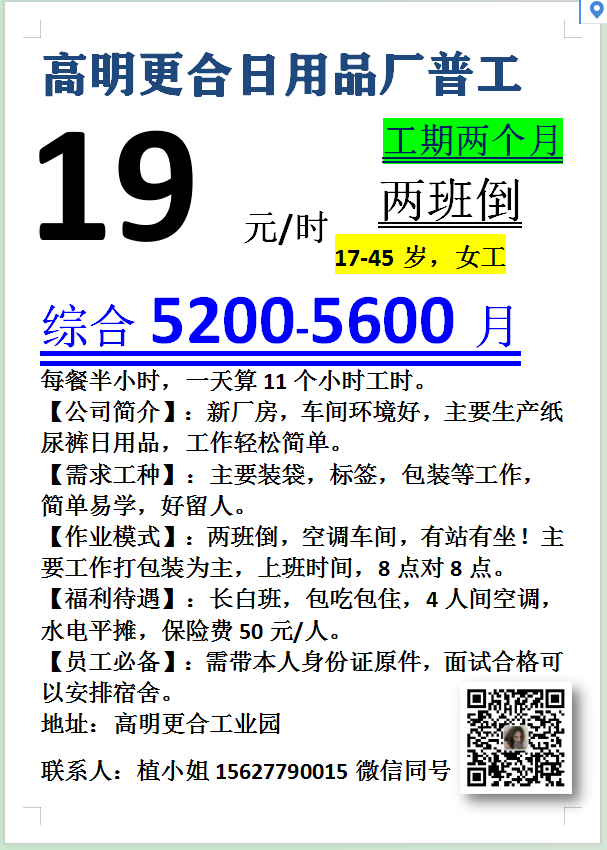 要求:性别不限,18-455300-6200/月能接受偶尔上夜班,白班10小时/天,夜班8小时/天,夜班补贴55元/天,计时+集体计件。