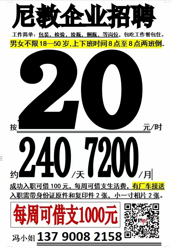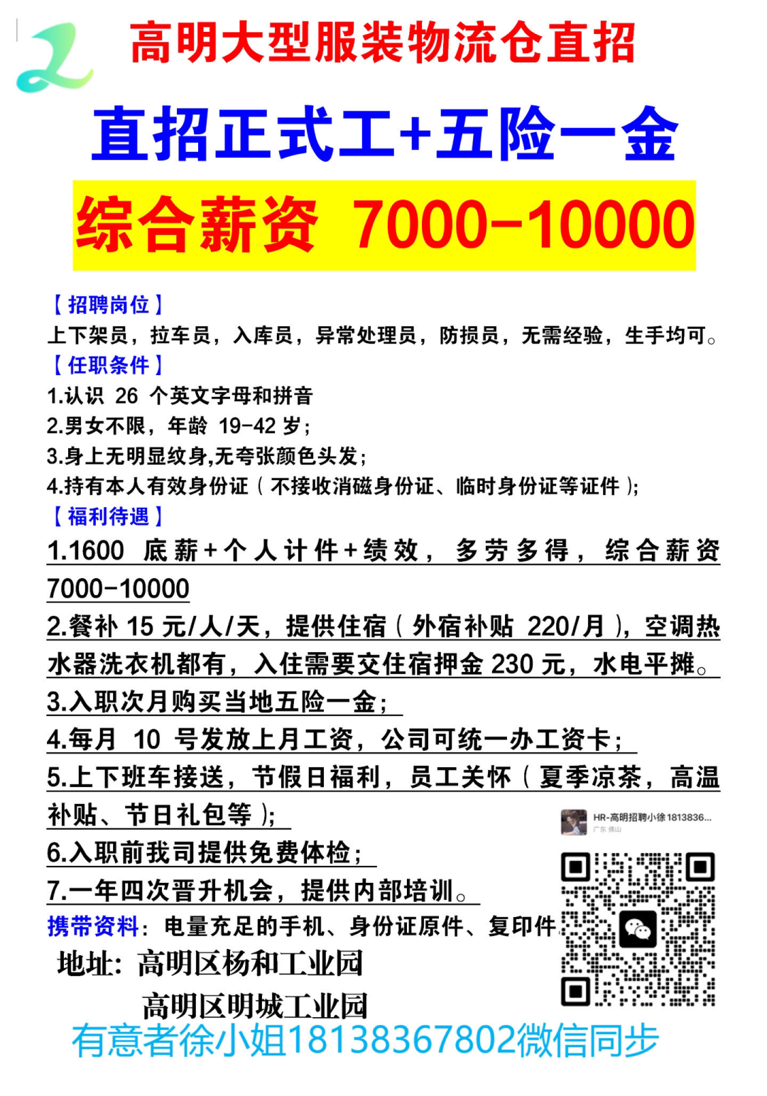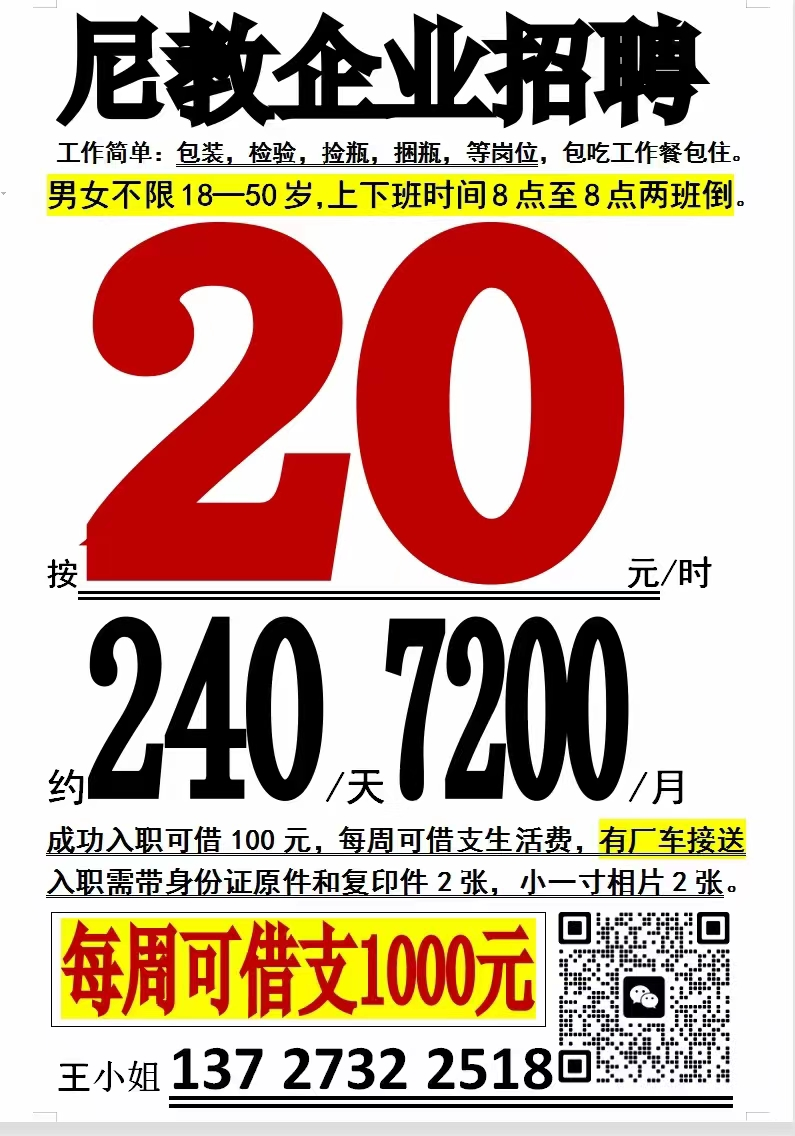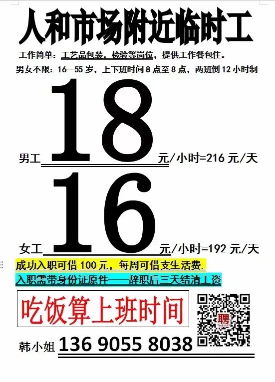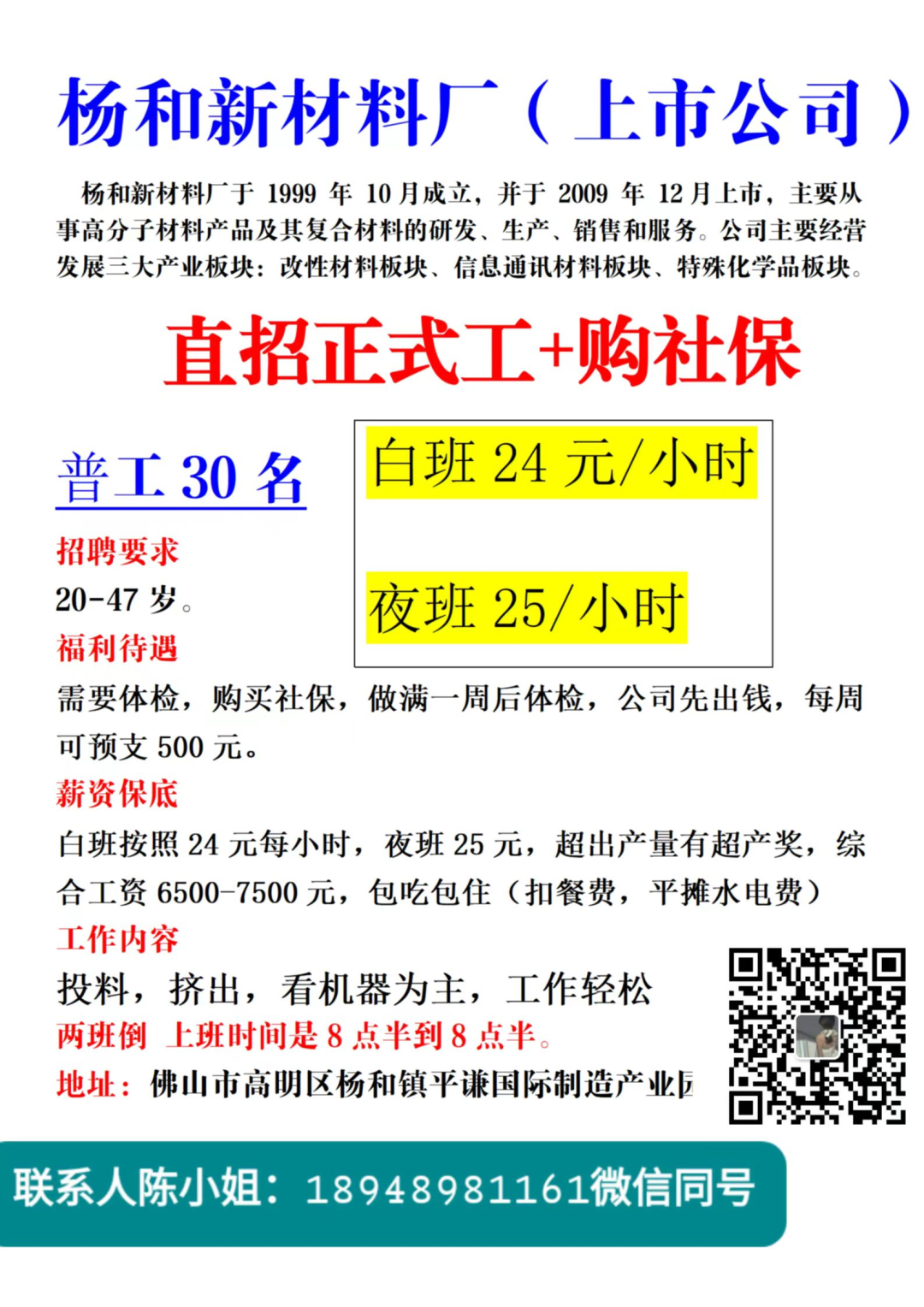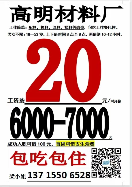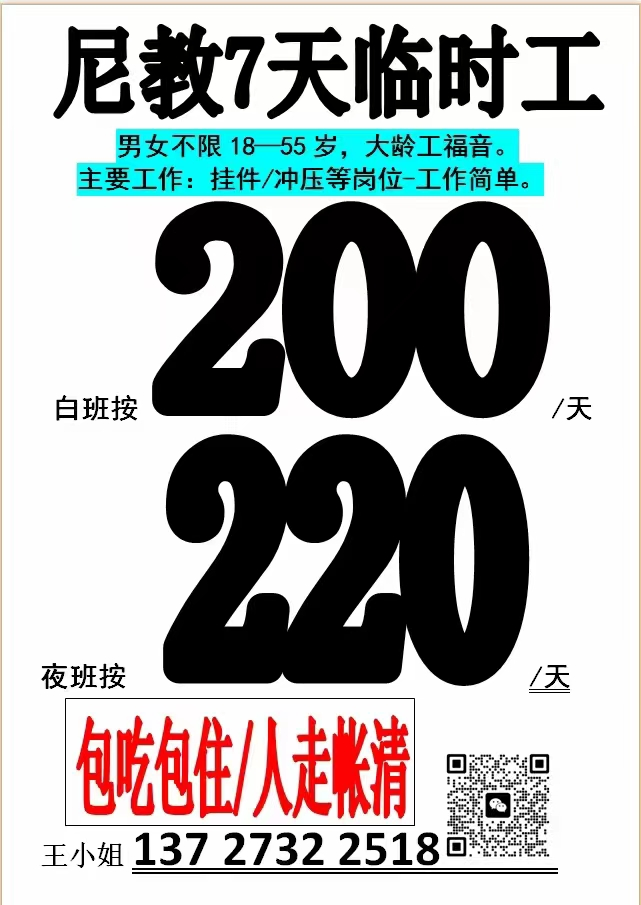 要求:性别不限,18-455300-6200/月能接受偶尔上夜班,白班10小时/天,夜班8小时/天,夜班补贴55元/天,计时+集体计件。