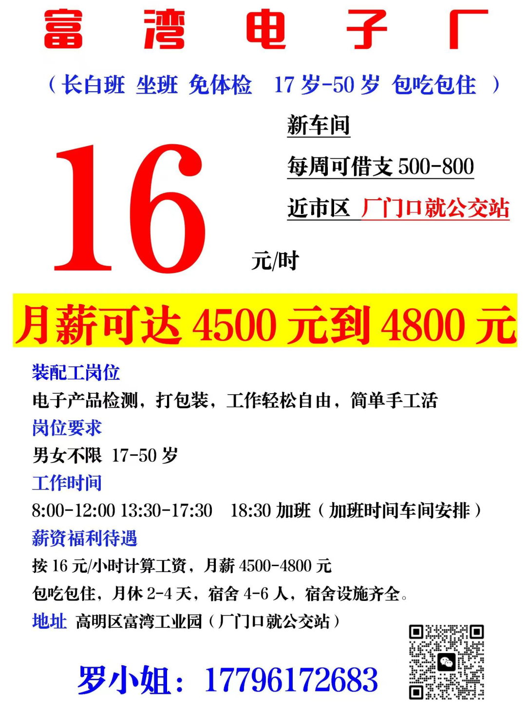 要求:女,18-45岁,4500-5500/月长白班,每天10.5小时/天。前3月保底计时,后面个人计件;