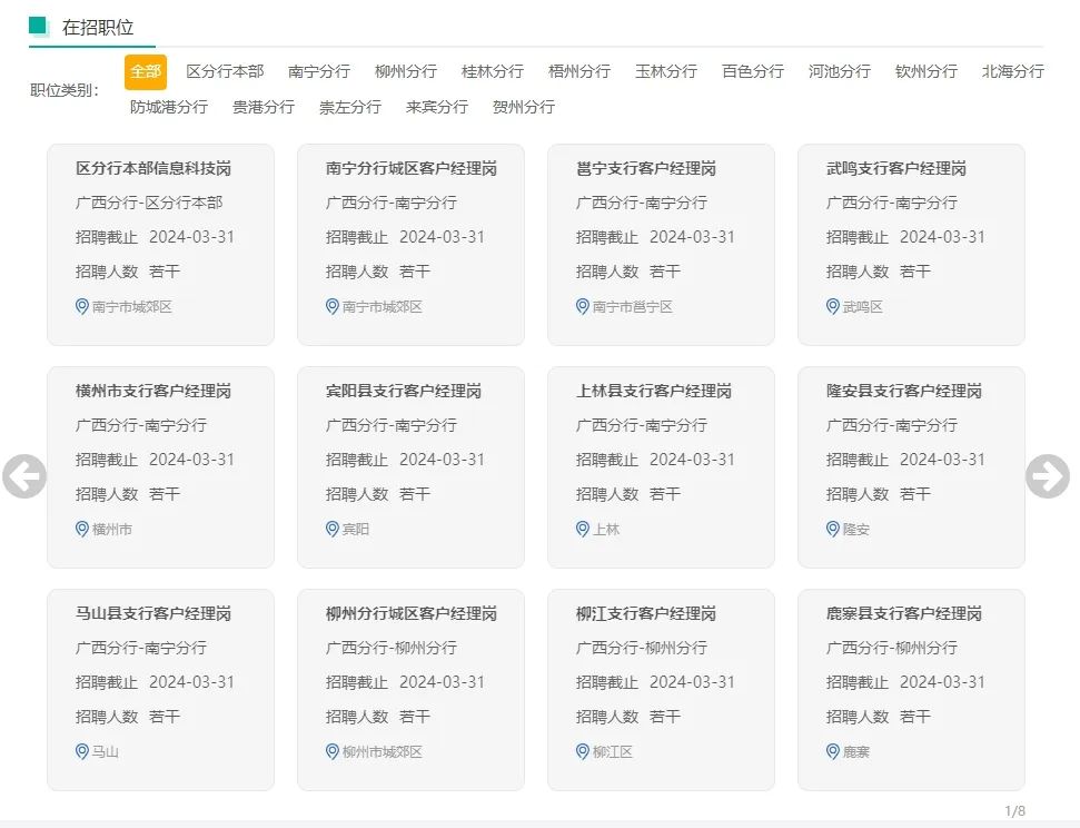 玉林控股集团下属企业玉林市能源投资有限公司 一、企业简介 广西玉林投资控股集团有限公司(以下简称“玉林控股集团”)成立于2022年3月19日,注册资本为30亿元人民币,是玉林市人民政府直属的国有独资企业。玉玉林市能源投资有限公司(以下简称“能源公司”)成立于2023年11月7日,注册资本为10亿元人民币,是集投资、建设、开发、运营及管理为一体的综合性发电、蓄能、配电、充电桩、石油燃气、节能等投资,担负玉林市能源产业发展、建设、投融资、运营和开发利用等职能,作为玉林控股集团的重要子公司管理。 二、招聘岗位及条件 详见《玉林控股集团下属企业玉林市能源投资有限公司2024年第一批员工公开招聘岗位汇总表》(附件1),大专及以上学历。 三、招聘程序 从2024年3月11日12:00起至2024年3月18日12:00止。 本次招聘采取网络报名方式。 四、薪酬及福利待遇 (一)应聘人员一经聘用,试用合格,按能源公司薪酬标准执行,享受聘用岗位相应的薪酬待遇。 (二)社会保险及福利待遇按国家及公司相关政策执行。 附件1 :玉林控股集团下属企业玉林市能源投资有限公司2024年第一批员工公开招聘岗位汇总表.xlsx 附件2:2024年玉林控股集团旗下玉林市能源投资有限公司公开招聘报名表.doc 附件3:2024年玉林控股集团旗下玉林市能源投资有限公司公开招聘报名信息表.xlsx ▲扫码回复 12 查看完整公告丨下载附件 中国农业银行广西壮族自治区分行 一、公司简介 中国农业银行是中国主要的综合性金融服务提供商之一,致力于建设经营特色明显、服务高效便捷、功能齐全协同、价值创造能力突出的国际一流商业银行集团。自2014年起,连续十年入选全球系统重要性银行。2023年,在《财富》杂志世界500强排名中位列第32位;在《银行家》杂志全球银行1000强排名中位列第3位。中国农业银行广西壮族自治区分行是中国农业银行的一级分行,是广西区内核心主流银行之一,下辖14个二级分行,110多个一级支行,700多个营业网点。 二、招聘岗位 招聘需求 (480人),各岗位的工作职责、应聘条件和具体要求见职位详情。 (点击查看大图) 三、招聘程序 即日起—2024年3月31日网上报名; 四、注意事项 我行将通过农行招聘网站站内信和手机短信等方式,通知入围笔面试人员后续流程的具体时间和形式。应聘者的手机号码、邮箱等联系方式如发生变更,务必及时登录招聘系统进行更新,以确保通信畅通。 五、待遇参考 带薪年假,健康体检,住房补贴,伙食补贴,六险二金等。 ▲扫码回复 12 查看完整公告丨下载附件 广西龙港广投燃气有限公司 一、公司简介 广西龙港广投燃气有限公司于2022年6月1日由广西广投燃气有限公司与玉林产投实业有限公司共同出资成立,广西广投燃气有限公司占股51%,玉林产投实业有限公司占股49%。广西龙港广投燃气有限公司承担龙港新区玉林龙潭产业园区天然气直供管道工程的投资建设运营。 二、招聘岗位 工作人员 三、招聘条件 20-45岁,大专及以上文化程度,油气储运、机械、电气等相关专业。要求吃苦耐劳、有责任心、学习与动手能力强。 四、招聘程序 本次招聘报名采用网上投递的方式,报名时间:2024年3月11日起至3月23日下午18:00止。 四、薪酬待遇 年薪5-6万,工资按月发放。试用期1-2个月,试用期间岗位工资及绩效工资按80%发放,入职即购买五险一金。录用人员以劳务用工形式签订劳动合同,视工作表现优先考虑转公司正式编制。 ▲扫码回复 12 查看完整公告丨下载附件 玉林北流市大坡外镇人民政府 一、招聘岗位 村级就业服务专员5人 二、招聘条件 原则上应具有高中(中职)及以上文化程度,能熟练操作电脑、手机等现代设备及信息系统,如能力适合岗位需求者可适当放宽招用条件; 三、招聘程序 报名时间:从即日起到招聘满为止。咨询电话见公告。 四、待遇情况 岗位补贴标准不高于最低工资标准的1.2倍。 ▲扫码回复 12 查看完整公告丨下载附件 广西大学生乡村医生专项计划 一、招聘岗位 我区面向医学专业高校毕业生用事业编制招聘677名村卫生室工作人员,广西14地市有岗; 二、招聘条件 1.具有中华人民共和国国籍,享有公民基本政治权利,遵守宪法和法律,品行良好,有意愿长期从事我区乡村医生工作; 2.学历及专业:临床医学、中医学、中西医结合专业全日制大专及以上学历(符合报考执业(助理)医师资格的学历要求); 三、招聘程序 1.时间:2024年3月12日9:00—3月19日12:00。 2.方式:本次招考采取线上报名。 四、聘用管理 考察合格者为拟聘用对象,经公示7个工作日无异议的,按权限批准后由基层医疗卫生机构与受聘人员签订聘用合同,纳入事业编制,并明确派至具体村卫生室服务,履行对受聘人员日常管理职责。 附件:广西壮族自治区大学生乡村医生专项计划招聘人员岗位信息表 ▲扫码回复 12 查看完整公告丨下载附件 紫金财产保险股份有限公司广西分公司 一、公司简介 紫金财产保险股份有限公司(简称“紫金保险”)成立于2009年5月,总部位于南京市,是江苏省首家全国性财产保险公司,注册资本金60亿元人民币。作为省财政厅主管的国有大型金融企业,紫金保险在江苏金融四梁八柱体系中占据重要位置。 二、招聘岗位 四级机构筹建负责人(容县、陆川、兴业)、理赔人伤岗(急)等6个岗位,若干人; 三、招聘条件 部分岗位全职、兼职均可,具体见