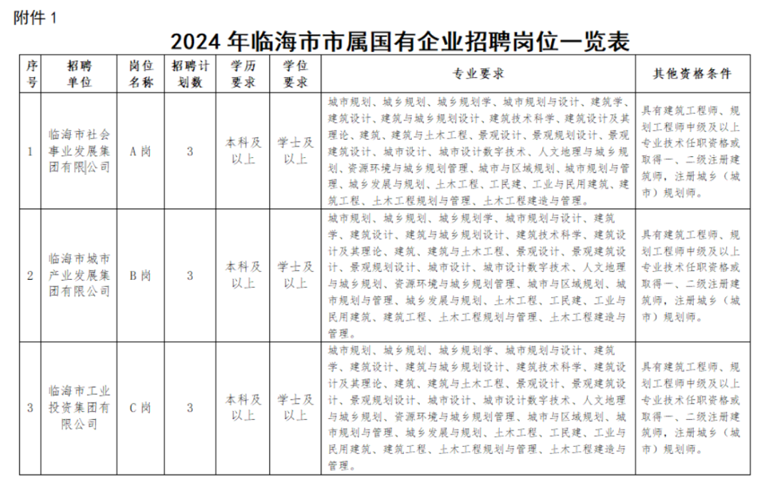 一、招考岗位 本次计划招聘国有企业编制工作人员9名,派驻到临海市自然资源和规划局统筹使用。其中:临海市社会事业发展集团有限公司3名(A岗),临海市城市产业发展集团有限公司3名(B岗),临海市工业投资集团有限公司3名(C岗)。具体招聘岗位、人数和报考资格条件详见《2024年临海市市属国有企业招聘岗位一览表》(附件1),可登录临海人才网(http://www.lhrc.com.cn)、临海发布(微信公众号)查阅,临海人才网为本次公开招聘相关信息的指定发布平台。