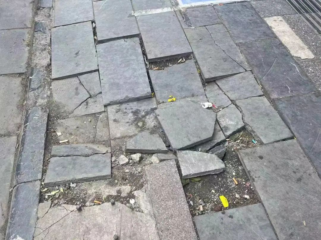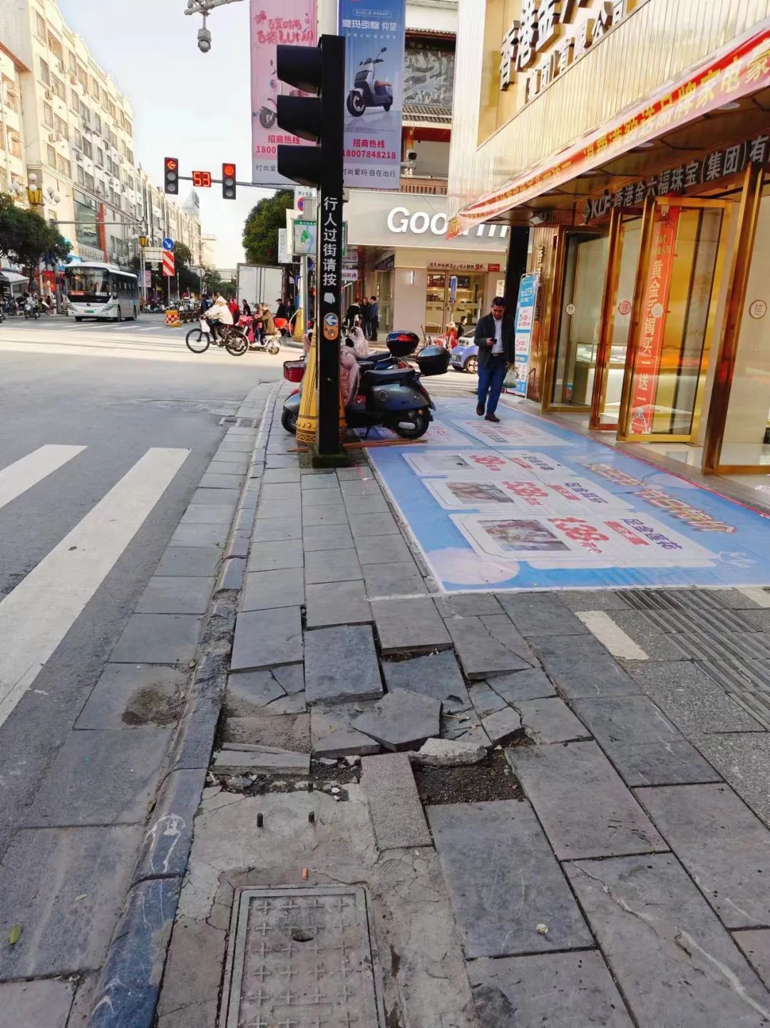 网友爆料:在建设路往风雨桥路段,人行道上的路面已经变得坑坑洼洼,石板也碎了,地面甚至有些凹陷,希望路政部门可以关注一下,尽快修复好,谢谢。