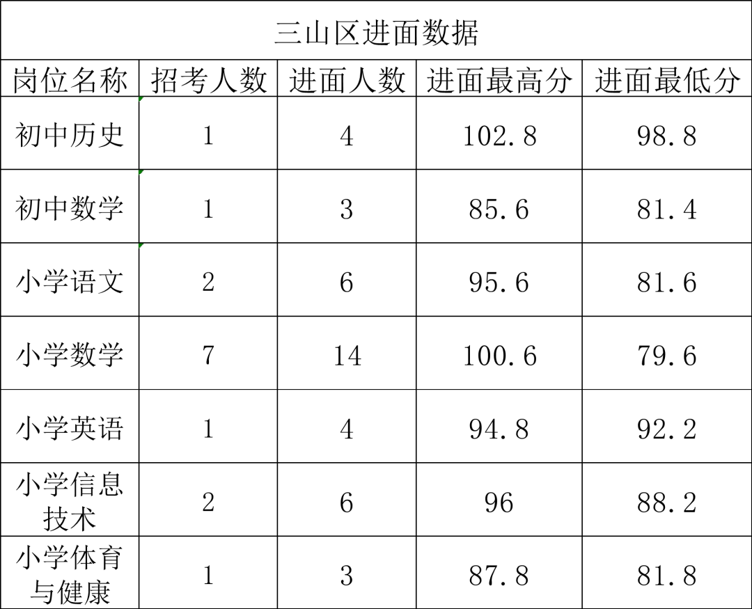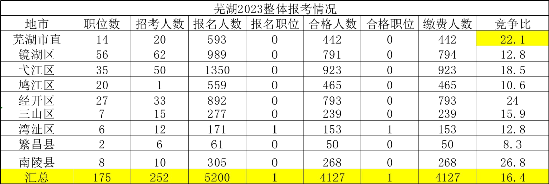 临近考试 格格特意给大家准备了 23年安徽各地市整体报考情况 宝子们可以以此为参考 安排自己的报名哦~ ![]() 2023 年芜湖共招录 252 人,共 175 个岗位,23 年整体报名人数为 5200 人,缴费人数为 4127 人岗位竞争比为 16.4。 ![]() 芜湖市直 共招录 20 名,14 个岗位,报名人数为 593 人,缴费人数为 442,竞争比为 22.1,各岗位均要求 35 周岁以下可报,专业有限制,5 个岗位要求具有小学全科教师资格证且有性别限制。 ![]() ![]() 镜湖区 共招录 62 名,56 个岗位,报名人数为 989 人,缴费人数为 794,竞争比为 12.8,各岗位均要求 35 周岁以下可报,专业有限制,部分岗位要求具有小学全科教师资格证且有性别限制。 ![]() ![]() ![]() ![]() ![]() ![]() ![]() 弋江区 共招录 50 名,35 个岗位,报名人数为 1350 人,缴费人数为 923,竞争比为 18.5,各岗位均要求 35 周岁以下可报,专业有限制,部分岗位要求具有小学全科教师资格证。 ![]() ![]() ![]() 鸠江区 共招录 44 名,20 个岗位,报名人数为 559 人,缴费人数为 465,竞争比为 10.6,各岗位均要求 35 周岁以下可报,专业有限制,部分岗位要求具有小学全科教师资格证。 ![]() ![]() 经开区 共招录 33 名,27 个岗位,报名人数为 982 人,缴费人数为 793,竞争比为 24,各岗位均要求 35 周岁以下可报,专业有限制,部分岗位要求具有小学全科教师资格证,且部分岗位有性别限制。 ![]() ![]() 三山区 共招录 15 名,7 个岗位,报名人数为 277 人,缴费人数为 239,竞争比为 15.9,各岗位均要求 35 周岁以下可报,专业有限制,部分岗位要求具有小学全科教师资格证。 ![]() ![]() 湾沚区 共招录 12 名,6 个岗位,报名人数为 174 人,缴费人数为 153,竞争比为 12.8,各岗位均要求 35 周岁以下可报,专业有限制,部分岗位要求具有小学全科教师资格证。 ![]() ![]() 繁昌区 共招录 6 名,2 个岗位,报名人数为 61 人,缴费人数为 50,竞争比为 8.3,各岗位均要求 35 周岁以下可报,专业有限制,部分岗位要求具有小学全科教师资格证。 ![]() ![]() 南陵县 共招录 10 名,8 个岗位,报名人数为 305 人,缴费人数为 268,竞争比为 26.8,各岗位均要求 35 周岁以下可报,专业有限制。 ![]() ![]() • end • |