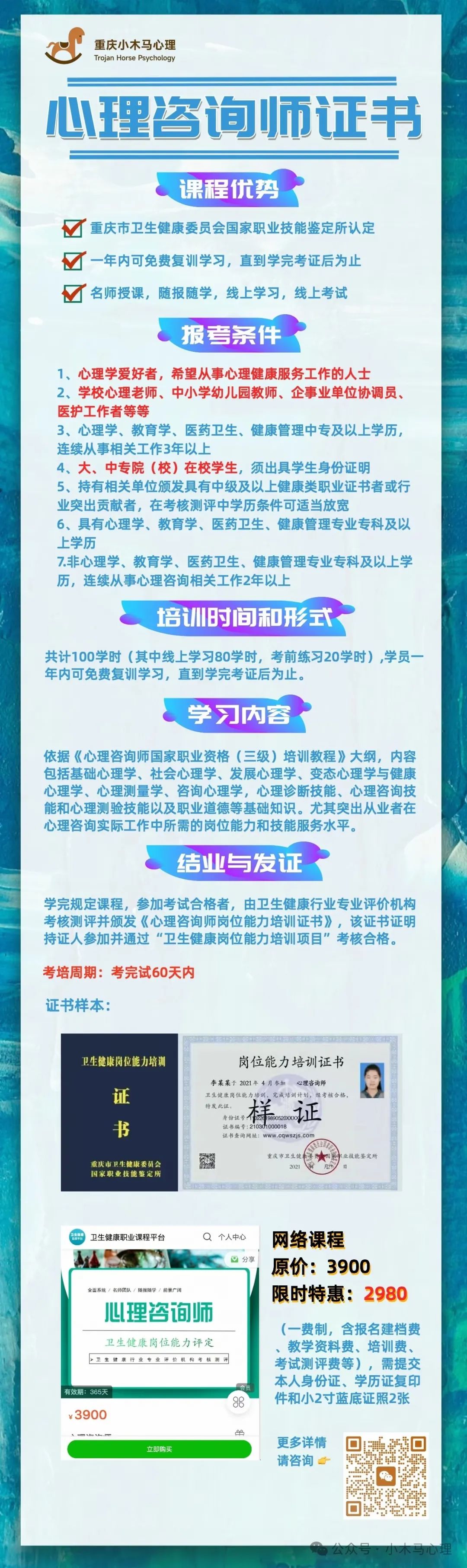 心理咨询师是运用心理学知识,通过专业方法帮助求助者解除心理问题的专业人员。心理健康是公民健康的重要组成部分,我国当前心理亚健康状态的人群广泛。应配备专业心理咨询师,加强重点人群心理健康服务,提升行业从业者能力。特面向社会开展卫生健康岗位能力《心理咨询师》培训测评项目。 ![]() 【试听课链接】 https://appxualexid4584.h5.xiaoeknow.com/p/course/video/v_609b9fd1e4b07163a65b9bb2?product_id=p_606ec60ce4b0d4eb038f883f 点击👇下方蓝字阅读原文也可试听课程 |