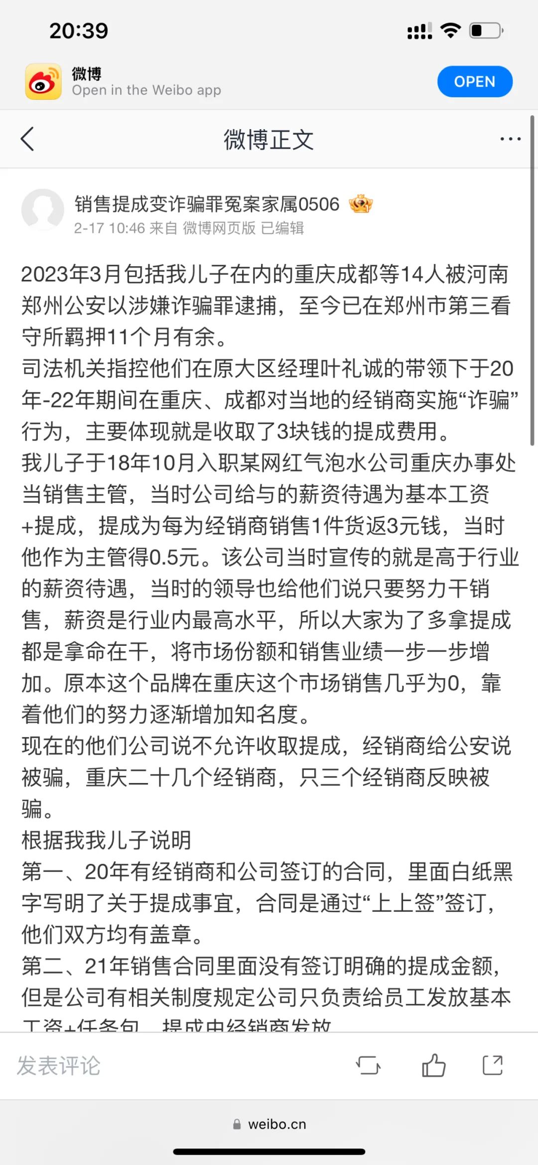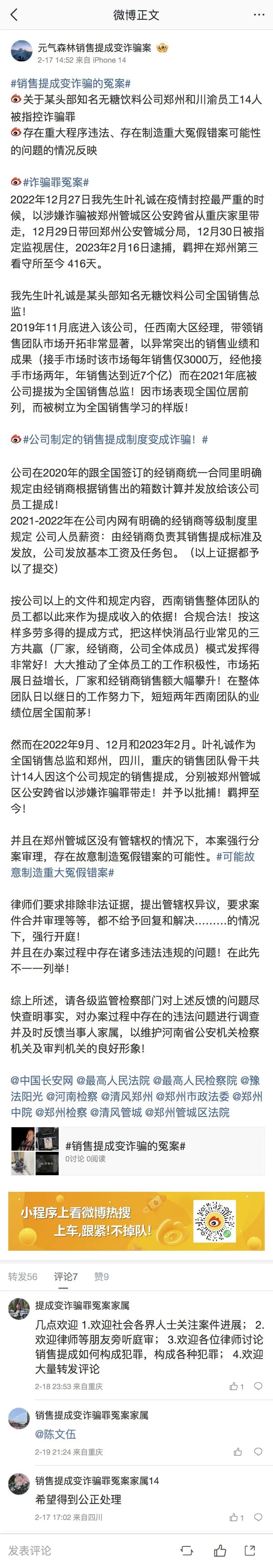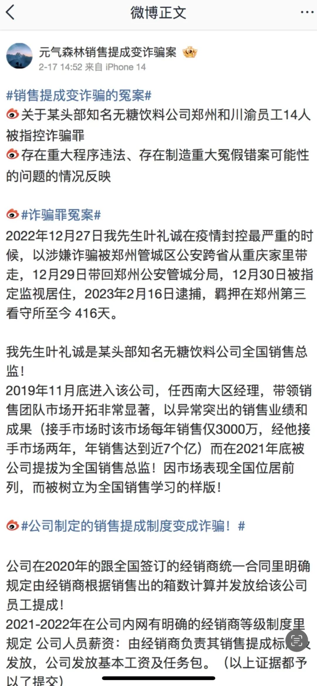 近日,有微博发帖称元气森林公司多名川渝籍员工被郑州警方以涉嫌诈骗罪名逮捕,引发社会关注。据悉,这14名员工被指控于2020至2022年间,在原西南大区经理叶礼诚带领下,以销售提成费用名义诈骗当地经销商。 目前他们已在郑州市第三看守所羁押11个多月。历经2次检察院退回公安侦查。 据其微博陈述,元气森林公司制度规定,由公司发放员工底薪,而销售提成则由经销商根据销量情况支付,作为一种常见的业绩激励手段。