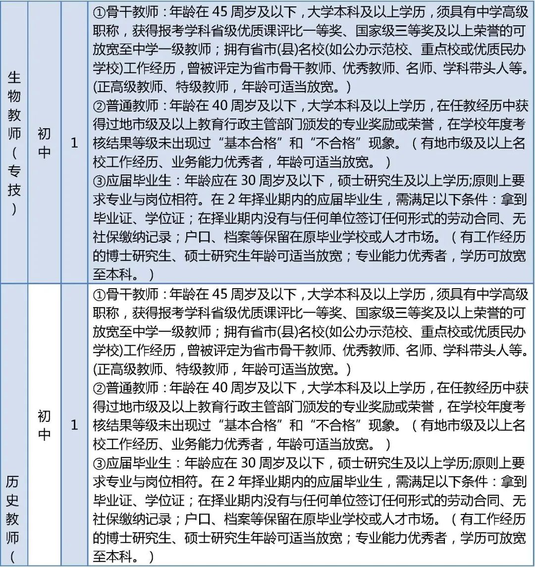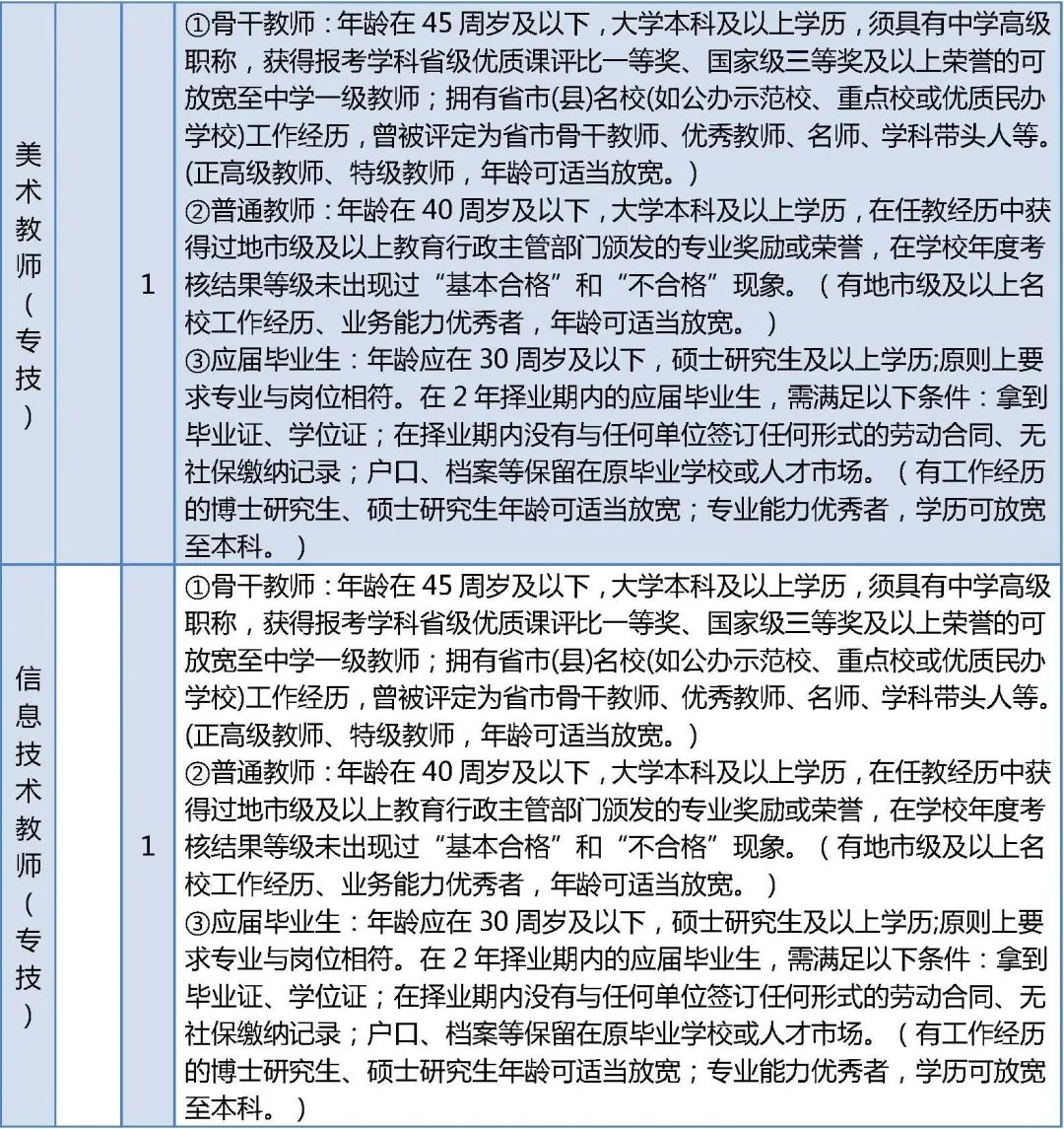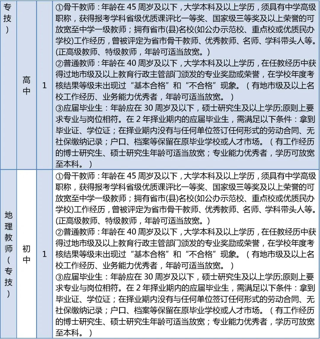 ②普通教师:年龄在40周岁及以下,大学本科及以上学历,在任教经历中获得过地市级及以上教育行政主管部门颁发的专业奖励或荣誉,在学校年度考核结果等级未出现过“基本合格”和“不合格”现象。(有地市级及以上名校工作经历、业务能力优秀者,年龄可适当放宽)