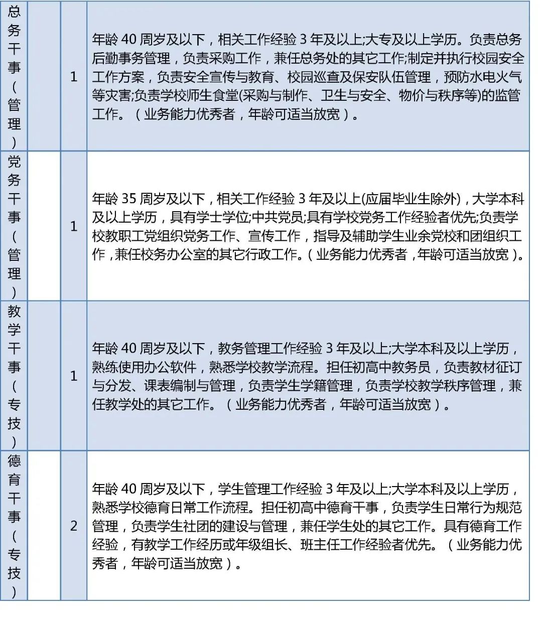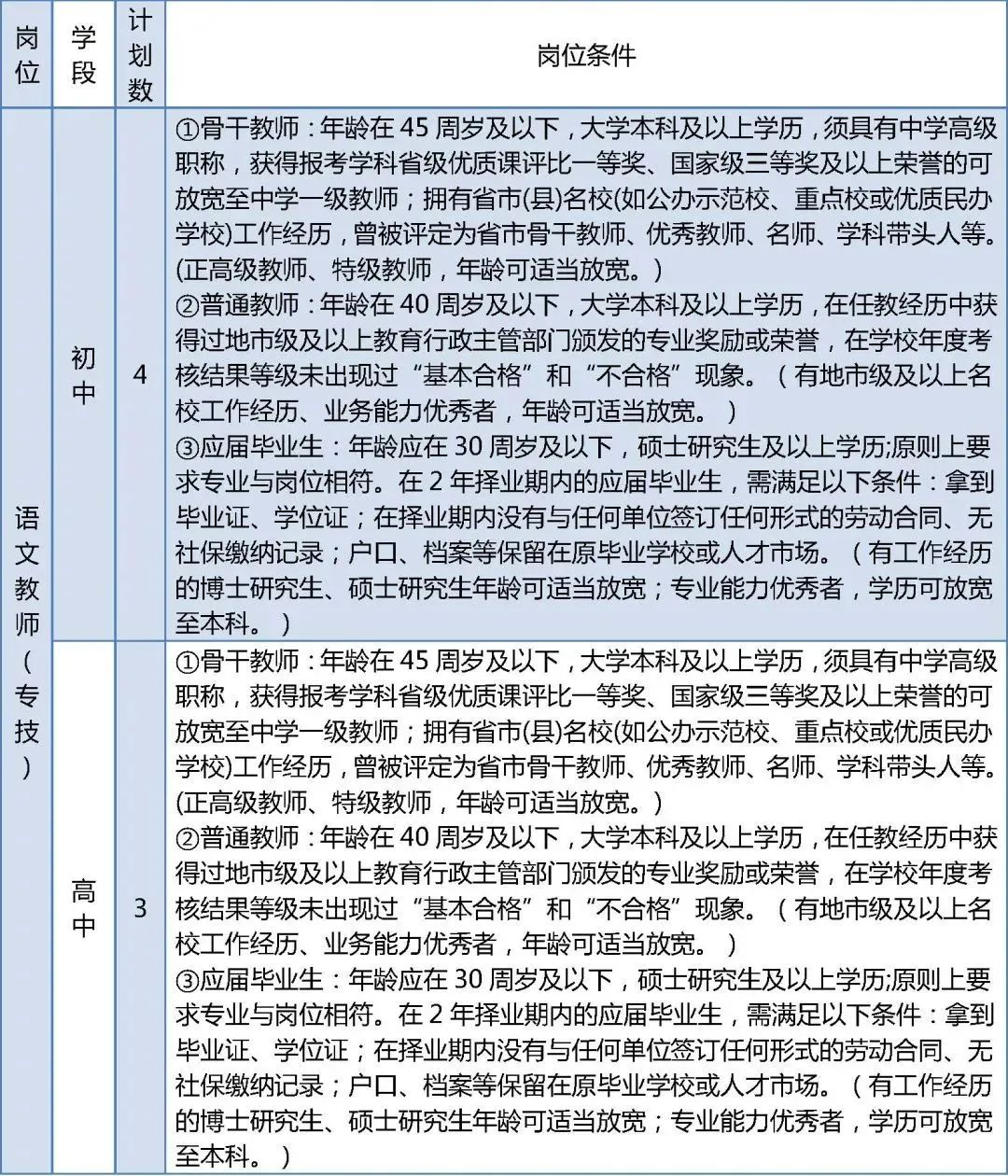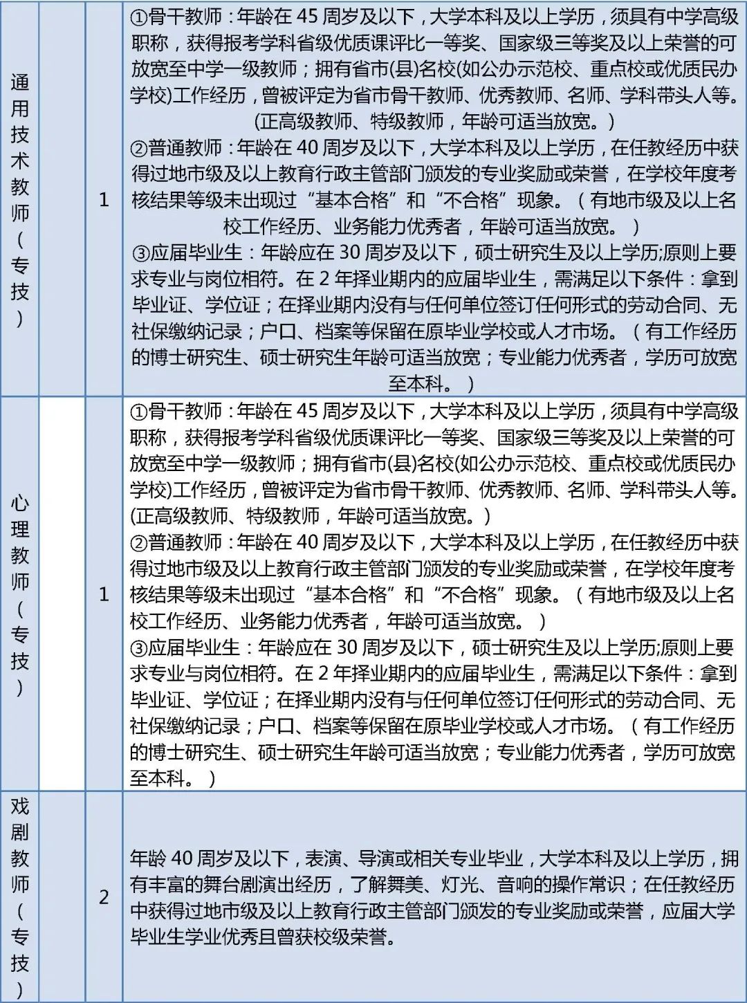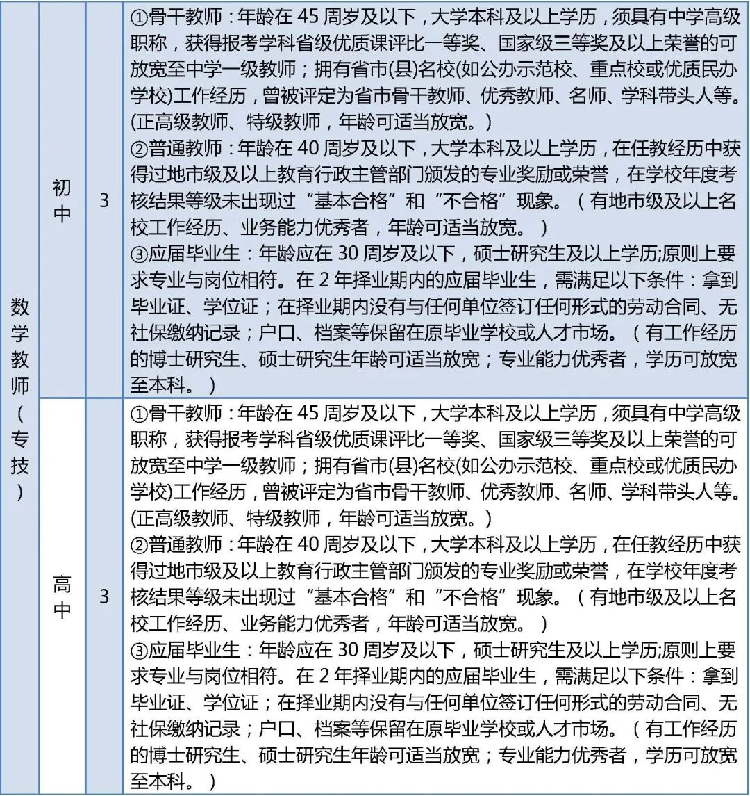 ②普通教师:年龄在40周岁及以下,大学本科及以上学历,在任教经历中获得过地市级及以上教育行政主管部门颁发的专业奖励或荣誉,在学校年度考核结果等级未出现过“基本合格”和“不合格”现象。(有地市级及以上名校工作经历、业务能力优秀者,年龄可适当放宽)