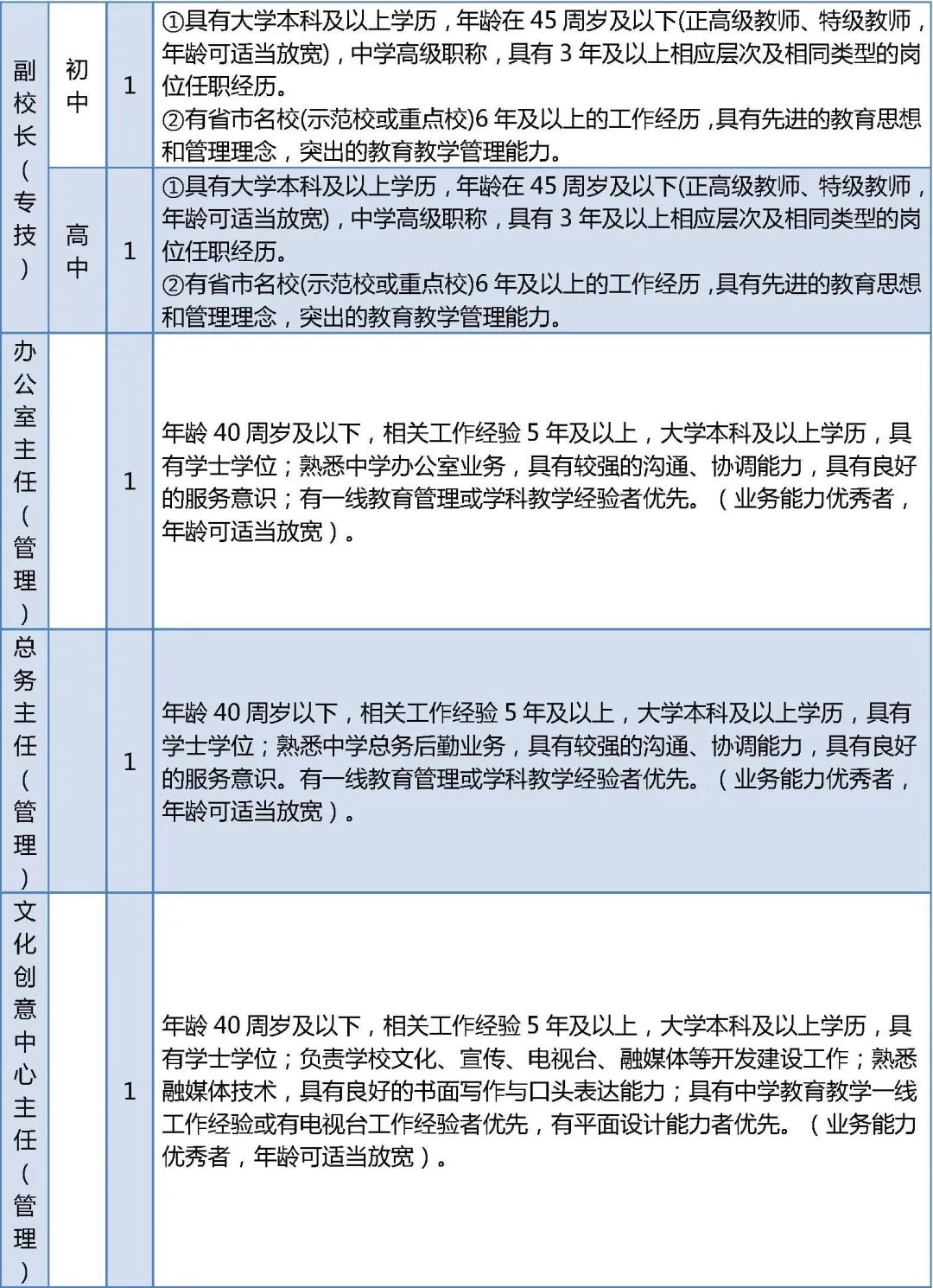 ①具有大学本科及以上学历,年龄在45周岁及以下(正高级教师、特级教师,年龄可适当放宽),中学高级职称,具有3年及以上相应层次及相同类型的岗位任职经历。