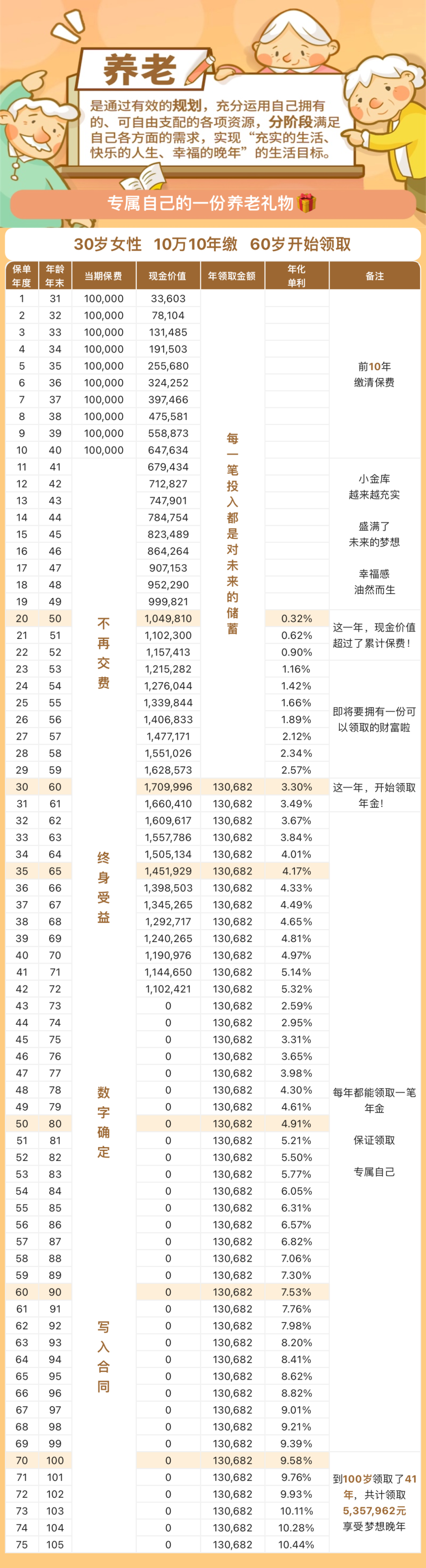 我们都希望活的更长久,80 岁起步,90 岁刚好,100 岁在未来可能也更加普遍。可是,如果你为养老存的 300 万,花到 70 多岁就没了,却能活到 90 岁,该怎么办呢?有钱的老年生活是享福,没钱的老年生活是受罪。假如把这 300 万换成养老年金,与你生命等长的现金流,活到 90 领到 90,活到 100 就领到 100,是不是会更好?
