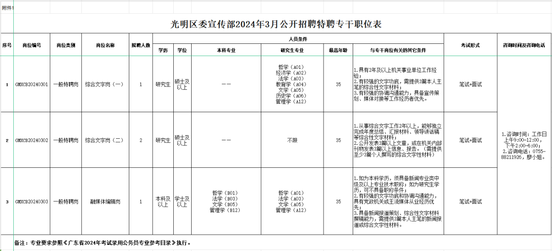 回复「简历」,送你6份简历模板。 根据工作需要,中共深圳市光明区委宣传部面向社会公开招聘4名特聘专干。现将有关事项公告如下: ![]() 招聘职位及人数详见《光明区委宣传部2024年3月公开招聘特聘专干职位表》(附件1),职位专业要求可参考《广东省2024年考试录用公务员专业参考目录》(附件6)。 (一)资格条件 1.具有中华人民共和国国籍,年龄在18周岁以上; 2.遵纪守法,具有良好的政治素质和道德品行,具有正常履行报名岗位工作职责的身体条件、心理素质和符合岗位要求的工作能力; 3.符合岗位所要求的资格条件; 4.符合岗位任职回避要求; 5.法律法规规定的其他条件。 (二)有下列情况之一的,不予接受报名 1.受过党纪、政纪处分以及正在接受有关部门审查尚未作出结论的人员; 2.被依法追究刑事责任人员; 3.在各级公务员考录、事业单位招考中被认定有舞弊等严重违反录用纪律行为的人员; 4.未完成教学大纲规定学习内容的结业生、肄业生; 5.现役军人; 6.法律法规规定的其他情形。 (一)报名 1.报名时间 即日起至2024年3月22日下午6:00(报名时间如有调整,将另行通知)。 2.报名资料 (2)《应聘人员报名信息采集表》(提供可编辑电子版,详见附件3); (3)本人身份证扫描件(正反面); (4)学历、学位证书扫描件; (5)学历、学位验证(学信网、学位网电子认证); (6)无违法犯罪记录承诺书扫描件(手写签名并按手印,详见附件4); (7)任职回避承诺书扫描件(手写签名并按手印,详见附件5); (8)岗位条件要求的其他证明材料(提供扫描件,详见附件1)。 注意事项:《光明区委宣传部2024年3月公开招聘特聘专干报名表》、无违法犯罪记录承诺书、任职回避承诺书等报名材料必须手写签名。 3.报名方式 本次招聘采取网上报名方式进行。请将报名材料的电子版及扫描件一并打包发送至邮箱xcbbgs@szgm.gov.cn,报名材料请按顺序打包压缩,压缩包文件名为“报名岗位编号+岗位名称+考生姓名”(如GMXCB20240301+综合文字岗(一)+张三)。报名资料请在规定时间内发送至指定邮箱,报名时间截止后投递的资料不予受理。 报名咨询电话:见官网,联系人:廖小姐。 咨询时间:工作日上午9:00-12:00,下午2:00-6:00。 (二)资格初审 招聘单位根据工作安排,对考生的报名材料进行资格初审。审核通过的,于报名截止后的5个工作日内,以电话或短信方式通知考生参加考试,资格初审不合格的不予通知。 (三)注意事项 1.每人限报考一个岗位; 2.报考人员的学历、学位必须与岗位要求一致; 3.具有国(境)外学历、学位人员需提供教育部所属的相关机构的学历、学位认证函及有关证明材料; 4.报考的最高年龄、取得相关职称或职业(执业)资格证书等时间的计算,均截至本公告发布前一天; 5.报考人员所留的联系电话、电子邮箱、通讯地址必须真实准确,确保能够及时联系本人。因提供错误信息或未保持通讯畅通致无法及时联系而产生的后果,由报考人员本人承担。 考试采取“笔试+面试”形式开展(详见附件1)。考试总成绩=50%笔试成绩+50%面试成绩。具体考试时间及地点待定,另行通过短信或电话方式通知。 本次考试统一划定笔试合格线60分,根据笔试成绩高低排序,按岗位招聘人数不低于1:3的比例确定进入面试人选。同一岗位面试对象达不到1:3比例的,按实际通过笔试合格线人数确定面试对象,但该岗位最终拟录用对象的总成绩不得低于70分。考试结束后,结合考生考试总成绩,按招录人数1:1比例确定进入体检环节人员名单。体检人员名单将在光明区政府在线网站(http://www.szgm.gov.cn/)上进行公布。 取得体检资格的人员须自发布体检通知之日起3个工作日内,自行前往国内任意一家三甲以上资质医院进行体检,体检报告在资格复审时一并提交。不按时参加体检者,视为自动放弃;体检不合格者不予录用。体检标准参照《公务员录用体检通用标准(试行)》执行,费用自理。 体检合格的人员,由我部进行资格复审,并对其思想政治表现、道德品质、业务能力、工作实绩等情况,结合工作岗位要求进行综合考察。复审考察合格的,确定为拟聘人员,复审考察不合格的,取消聘用资格。 经考试、体检、资格复审、考察合格的拟聘人员,在光明区政府在线网站(http://www.szgm.gov.cn/)公示不少于5个工作日。拟聘人员经公示,没有投诉或有投诉经查不属实或属实但不影响聘用,且不违反聘用和任职回避有关规定的,确定为聘用人选。 进入体检、资格复审或公示环节的考生,如出现体检、资格复审不合格,放弃体检、资格复审资格,或公示中发现问题不予录用的,相应岗位可按考生考试总成绩从高分到低分的顺序依次递补体检、资格复审人选。 确定为聘用的人选,安排与劳务派遣机构签订劳动合同,并实行试用期制度,试用期包括在岗位聘用期限内。试用期满考核合格的,正式聘用;试用期考核不合格或试用期内发现不符合招考岗位资格条件的,取消聘用。 本次招聘人员用工形式为劳务派遣用工,薪酬待遇及晋升按光明区有关规定执行。 (一)本公告及其附件的“以上”“以下”“以前”均包含本数。 (二)本次考试不举办也不委托任何机构举办考试辅导培训班,不指定任何参考用书和资料。社会上任何针对本次考试以考试命题组、专门培训机构等名义举办的辅导班、辅导网站或发行的出版物、参考资料、上网卡等,均与本次考试的组织方无关。 (三)本次考