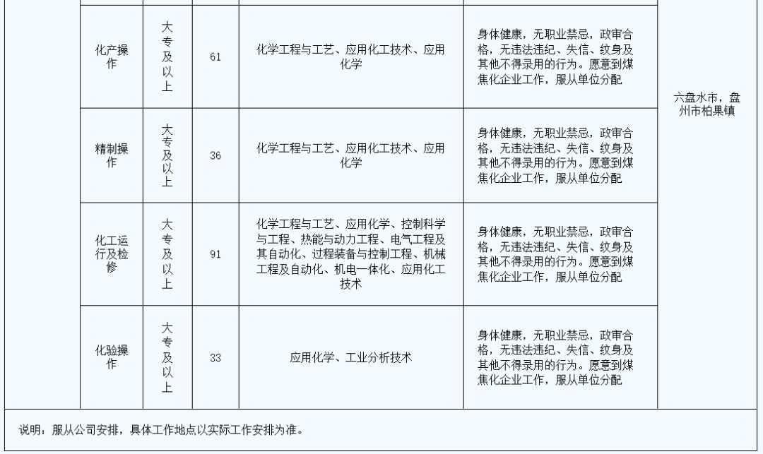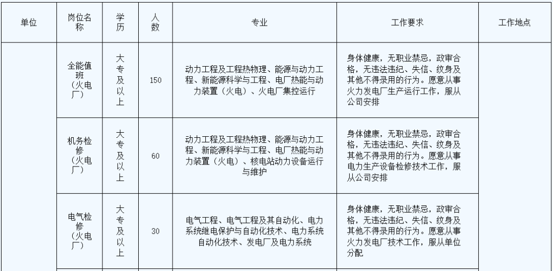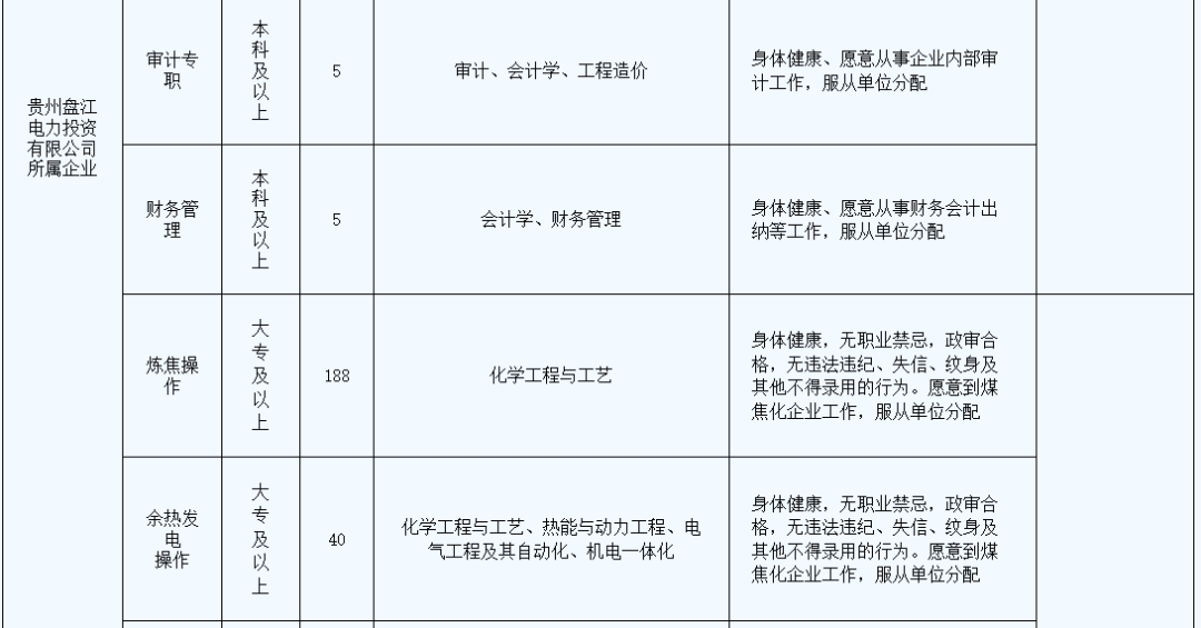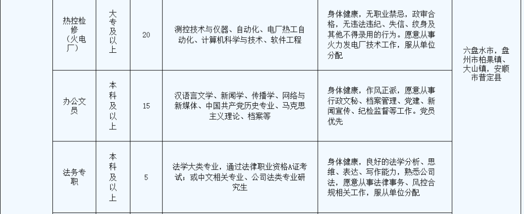 贵州能源集团电力投资有限公司招聘 (一)贵州能源集团有限公司(简称“贵州能源集团”)是省管大一型国有全资公司,是贵州省省委、省政府于2022年12月成立的大型能源企业集团。旗下拥有贵州能源集团电力投资有限公司等十八家二级企业,集团现有职工6.4万余人,注册资本200亿元,资产总额1300多亿元,煤炭保有储量107.1亿吨,煤炭产能4305万吨/年,电力装机规模315万千瓦,焦化产能833万吨/年,页岩气产能9亿立方米/年,天然气运营管道244千米。在2022年中国煤炭企业50强中排名第17位,是全国24户重点能源企业之一和我国长江以南最大的煤炭企业。 “十四五”期间,贵州能源集团坚持以习近平新时代中国特色社会主义思想为指导,坚决贯彻落实省委、省政府决策部署,围绕全国新型综合能源基地和西南地区煤炭保供中心建设主体、煤炭产业结构战略性调整实施主体的战略定位,立足资源优势,聚焦主责主业,坚持“煤电气化一体发展,综合业务协同支撑”的战略布局,统筹推进煤炭、先进煤电、新能源、天然气、现代煤化工及支撑保障业务等6大业务板块高质量发展,努力成为推动全省能源转变发展方式、调整优化结构、能源保供调度的重要平台和抓手,着力打造多能互补、清洁低碳、安全高效的资产营收双千亿级全国清洁能源供应商和全国一流能源企业。 到2025年末,煤炭产量5000万吨以上,电力装机达到1000万千瓦(含火电、光伏、风电、瓦斯发电),焦化产能1000万吨/年以上,非常规天然气产能30亿立方米,天然气运营管道700千米,营业收入1200亿元,资产总额达到1700亿元,为全省经济社会发展提供战略性基础性能源支撑 (二)贵州能源集团电力投资有限公司(原“贵州盘江电力投资有限公司”),成立于2018年6月,是贵州能源集团有限公司二级企业。前身为上世纪八十年代末广西和贵州共同投资兴建的盘县发电厂,于1991年7月开工建设,2001年8月全部建成5×200MW燃煤发电机组,是贵州省首座百万千瓦火力发电厂、国家电力公司“一流火力发电厂”;2007年公司实施“上大压小”改建工程,并于2013年底全部建成2×660MW超临界燃煤发电机组,是贵州省首台套单机容量最高、压力等级最高的超临界燃煤发电机组;2018年,根据贵州省委省政府战略部署,公司回归贵州,成为贵州能源集团二级企业,并于2023年10月正式更名为“贵州能源集团电力投资有限公司”。公司聚焦主责主业,着力推进先进煤电、新能源、现代煤化工等产业高质量发展。现有职工3000余人,资产总额206亿余元,已建成的盘州柏果“煤-焦-化-电”循环经济产业基地,是六盘水市循环经济教育示范基地、贵州省循环经济示范试点企业、贵州省“健康企业”、国家“绿色工厂”。充分发挥“煤电化一体化”循环经济产业优势,深度挖掘潜力,全力释放产能,多年以来,焦炭产能利用率100%,发电机组利用小时数位居全省统调火电机组前列,市场化交易电量规模常年居于全省前三位。为深入贯彻国发〔2022〕2号文件精神,抢抓“双碳”战略机遇,加快推进新能源产业发展,获得光伏及风电建设指标472万千瓦,开工建设光伏123万千瓦,并网发电35万千瓦;完成150万千瓦/300万千瓦时新型共享储能电站项目投资立项,计划于2025年建成投产。2021年、2022年营业收入连续突破百亿元大关,盈利能力逐年提升,核心竞争力持续增强。 一、招聘信息 (一)招聘概况 1、招聘对象:2023年毕业未就业人员,2024年即将毕业生 2、招聘时间:2023年10月1日至2024年6月30日。 3、招聘地点:具体地点以实际为准。 (二)岗位信息(详见表1) 表1:岗位信息表 二、应聘条件 (一)应聘者基本要求 1、具有中华人民共和国国籍,且无国(境)外永久居住权。 2、坚持社会主义道路,拥护中国共产党的领导,热爱祖国,热爱社会主义,热爱能源事业。 3、道德品行端正,遵纪守法,诚实守信,具备岗位所需的工作能力和其他任职资格条件,服从工作安排。 4、身体健康,具有正常履行招聘岗位职责的身体条件和心理条件,吃苦耐劳,爱岗敬业,服从安排。身体健康,无色盲、色弱、癫痫病、肺结核、精神病史、神经病遗传病史、心脏病、血液病、身体缺陷及其他行业禁忌等。 5、无刑事犯罪记录和其他不得聘用的违规违纪违法行为。 (二)任职资格条件 1、年龄18周岁及以上,25周岁及以下,具有硕士研究生及以上学历学位可适当放宽条件。 2、大专及以上学历,符合招聘岗位要求的专业及要求。 3、特别优秀的可适当放宽条件。 (三)凡有下列情形之一者,取消资格 1、不能坚持党的基本路线,在重大政治问题上不能与党中央保持一致的。 2、不能按规定取得毕业证、体检不合格、档案资料审查不合格,以及除不可抗力因素外本人原因放弃资格的。 3、已与用人单位签订就业协议或劳动合同,未经用人单位或人事主管部门同意解除就业协议或劳动合同的。 4、人民法院认定为失信被执行人或经有关政府行政主管部门认定被列为失信联合惩戒的。 5、曾受过司法机关刑事处罚的,曾被党纪、政纪处分的,涉嫌违法、违纪正在接受审查的,曾被开除公职或因个人原因被单位解聘的,以及法律、法规等有关规定不得聘用为国有企业工作人员的。 三、薪酬福利 (一)薪酬 1、试用期薪酬: 研究生:8000~10000元/月; 本科(985):7000~8000元/月; 本科(211):6000~7000元/月; 一般本科:6000元/月; 专科:4000~5000元/月; 试用期满考核合格,按公司规定享