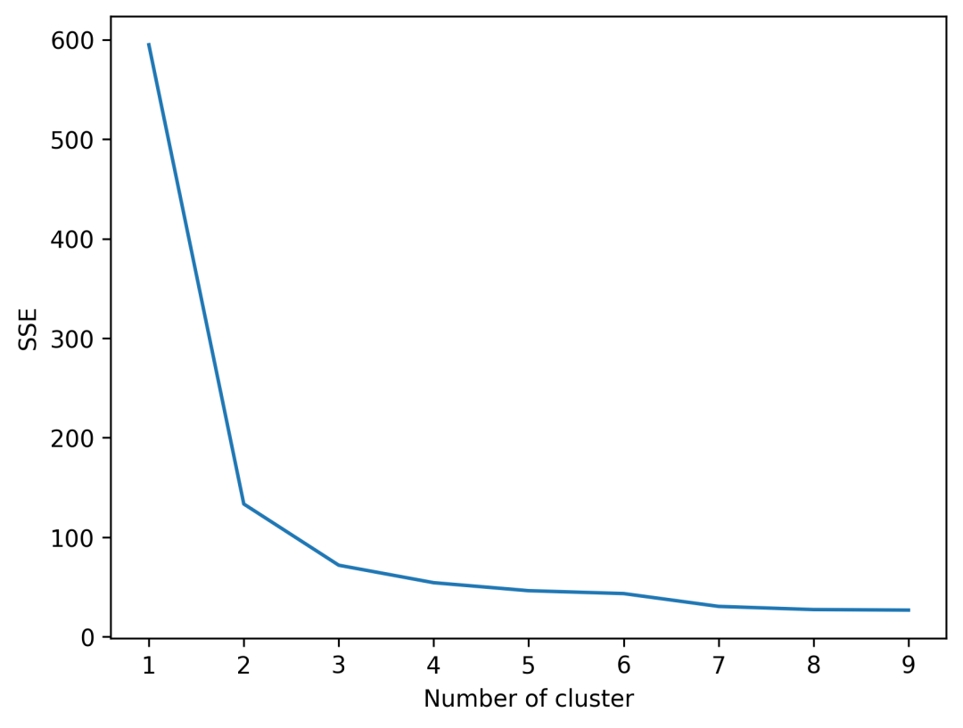 plt.figure(dpi=300) plt.plot(list(sse.keys()), list(sse.values())) plt.xlabel("Number of cluster") plt.ylabel("SSE") plt.show()