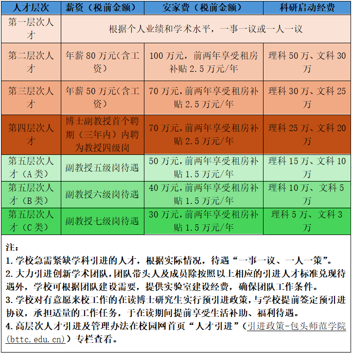 为进一步建设高水平的师资队伍 全面提升教育教学水平 包头师范学院现面向社会诚聘 高层次人才及优秀青年博士 一、学校简介 包头师范学院始建于1958年,坐落在享有“世界稀土之都”美誉的“草原钢城”——内蒙古自治区包头市,是一所以本科教育为主、研究生教育、继续教育、创新创业教育协调发展,融职前培养与职后培训为一体的普通高等师范院校。学校现有教职工1118人,在校生13594人。 学校目前设有17个教学单位,有6个一级学科硕士学位授权点、2个二级学科硕士学位授权点、8个硕士专业学位授权点、44个本科专业。拥有国家级一流本科专业建设点4个,国家级特色专业2个,“卓越教师培养计划改革项目”1个,教育部产学合作协同育人项目14个,自治区级本科专业综合改革试点1个,自治区级一流本科专业建设点12个,自治区级教学团队9个,自治区级品牌专业7个;国家级一流本科课程1门,自治区级精品课程25门,自治区级一流本科课程30门。 二、引进需求 三、引进待遇 (一)享受包头市人才引进待遇; (二)事业编制; (三)住房补贴30万元起;科研启动经费3-50万; (四)享受租房补贴:每年1.5万-2.5万元; (五)岗位工资最低享受副教授(专技七级岗)待遇; (六)享受包头市及学校的博士津贴1800元/月; (七)特殊人才可按“一事一议”的形式协商确定引进待遇,协商解决配偶工作、子女入学等需求。 四、联系方式 教师工作部(人事处)联系方式: 电子邮箱:rcb@bttc.edu.cn 联系电话:0472-6193032 ![]() |