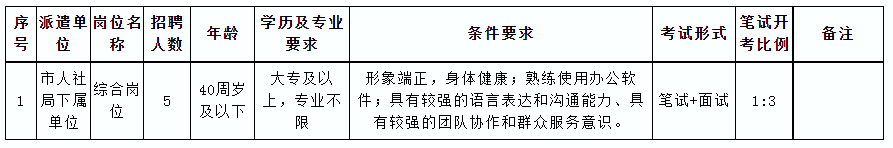 根据工作需要和用人单位委托,宜宾人才有限公司决定面向社会公开招聘5名编外工作人员,派遣到宜宾市人力资源和社会保障局下属单位工作。现公告如下: 一、招聘原则 坚持“公开、平等、竞争、择优”的原则,择优录取。 二、招聘对象、范围、岗位及报考条件 (一)招聘岗位和对象 所有符合本公告及相关岗位条件要求的社会在职、非在职人员。 (二)招聘名额 招聘名额5名,详见本公告附件1。 (三)招聘条件 1.报考者应同时具备的条件 (1)具有中华人民共和国国籍,热爱社会主义祖国,拥护中华人民共和国宪法,拥护中国共产党的领导,遵纪守法,品行端正,有良好的职业道德,爱岗敬业,事业心和责任感强; (2)服从安排,具有良好的政治素质和思想道德品质; (3)工作积极主动,具有较强的文字写作能力、良好的协作精神、服务意识及语言表达能力,熟练掌握计算机基本办公软件操作应用技能; (4)身体健康,体检合格,具备履行岗位职责所需的身体条件和心理素质; (5)学历及专业条件要求具体详见本公告附件1。报考人员必须在现场资格审查前取得岗位条件要求的国家认可毕业证等证书,未在规定时间内取得的,不予进入下一步招聘环节,且所有相关责任自负; (6)年龄计算截止日期2024年3月12日(如:“年龄40周岁以下”,指截止报名的第一日未满41周岁,以有效的身份证为准); (7)具备本公告具体招聘岗位要求的条件和资格(详见附件1)。 2.凡有下列情形之一的,不得报考 (1)曾受过各类刑事处罚的人员; (2)曾被开除公职的人员; (3)有违法、违纪行为正在接受司法机关立案侦查或纪委监委机关立案调查的人员; (4)受到诫勉、组织处理或者党纪政务处分影响期未满或者期满影响使用的人员; (5)现役军人; (6)有其他违反有关规定不适宜报考的人员。 三、开考比例 岗位招聘名额与有效报考人数之比不得低于1:3。报名达不到开考比例的职位,将进行调剂,或调减相应岗位招聘名额、或取消该招聘岗位。 四、程序和方法 本次招聘报名仅采取网络报名的方式进行,报名网站地址:“中国三江人才网”(https://www.ybrc128.com/)。 网上报名时间:2024年3月12日9:00至2024年3月15日12:00截止。 (一)报名 本次招聘报名采取网上报名的方式进行,请务必在报名前下载和认真阅读《考生报名指南》。 1. 选择岗位。请认真阅读本公告,详细了解招聘对象、范围、条件以及有关政策规定和有关注意事项等内容,请仔细阅读要求,根据自身情况报名。 2. 填报信息和上传照片。考生进入中国三江人才网(https://www.ybrc128.com/),按网络提示用本人有效身份证通过注册登录后找到本次招聘报考页面,如实、准确填写各项信息,同时按要求上传JPG格式(15-20kb)的近期免冠正面证件照片,照片须清晰。上传照片质量审查不合格的,报考者应按提示要求重新上传。报考人员填报的所有信息应当真实、准确、完整,以便招聘单位了解报考者基本情况。报名与考试时使用的身份证必须一致。 在招聘的任何环节发现报考者不符合报考条件、弄虚作假、违反回避和其他相关制度规定或同时参加了同批次多岗位报考的,由此取得的报考或聘用资格一律无效,责任自负。对虚假、恶意进行网络报名的,将按有关规定追究相关人员责任。 3.网上审查。网上审查工作由宜宾人才有限公司具体负责,考生对岗位要求的资格条件和其他内容有疑问的,可按照本公告中的咨询电话向招聘单位咨询。网络报名截止后,若考生的照片质量审查不合格、信息填写不规范、网上审查未通过,均不能进行修改或重新上传,由此产生的后果,责任自负。 (二)缴费 网上审查通过的考生,须于2024年3月15日10:00至2024年3月15日16:30到四川川南人力资源市场(地址:宜宾市翠屏区商业街53号)进行现场缴费。按照四川省发展和改革委员会、四川省财政厅川发改价格〔2017〕472号文件规定,笔试按50元/科缴费。通过网上审查合格的报考者未按要求在规定时间内缴费的,视为自动放弃报考。缴费成功者视为有效报考者。 下列考生可向宜宾人才有限公司递交减免申请材料,办理减免手续。考生未在规定时间内办理减免手续的,视为自动放弃。 1.享受最低生活保障金的城镇、农村家庭考生凭其家庭所在地的县(市、区)民政部门出具的享受最低生活保障的证明、特殊困难证明; 2.父母双亡、父母一方为烈士或一级伤残军人,且生活十分困难家庭的考生凭民政或退役军人事务部门出具的父亲或母亲烈士证明、父亲或母亲一级伤残军人证明,当地派出所出具的父母双亡证明等有效证件。 (三)打印准考证 网上报名成功的报考者,请于2024年3月16日10:00至2024年3月16日17:00在中国三江人才网(https://www.ybrc128.com/)打印本人准考证,逾期不打印准考证而影响考试的,责任自负。 考生打印准考证后,应仔细核对准考证上信息是否与本公告的一致,如有误,及时拨打本公告中的咨询电话处理,否则责任自负。 准考证是报考者参加笔试、面试、体检等各环节的重要证件,请妥善保管。 (四)笔试、面试 考试包括笔试和面试。 1.笔试 (1)卷面满分100分。主要考察应聘人员的政治理论水平、公文写作、分析问题、解决问题等方面的能力。 (2)笔试时间和地点。笔试时间、地点详见本人准考证。 (3)笔试成绩公布。笔试成绩将在中国三江人才网上公布,考生请自行登录网站查询。 2.现场资格审查 考生参加面试前须通过现场