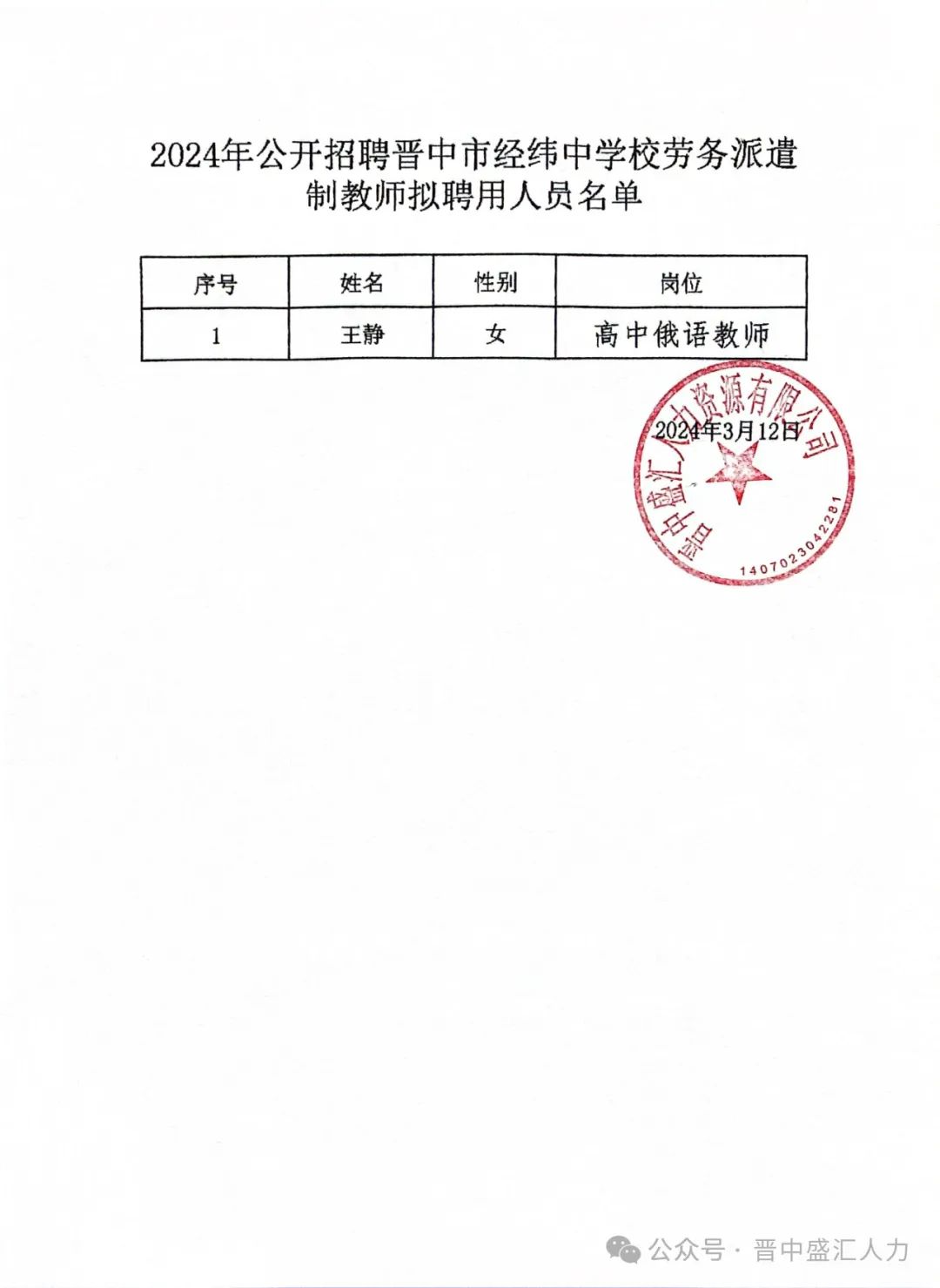 2024年公开招聘晋中市经纬中学校劳务派遣制教师拟聘用人员名单