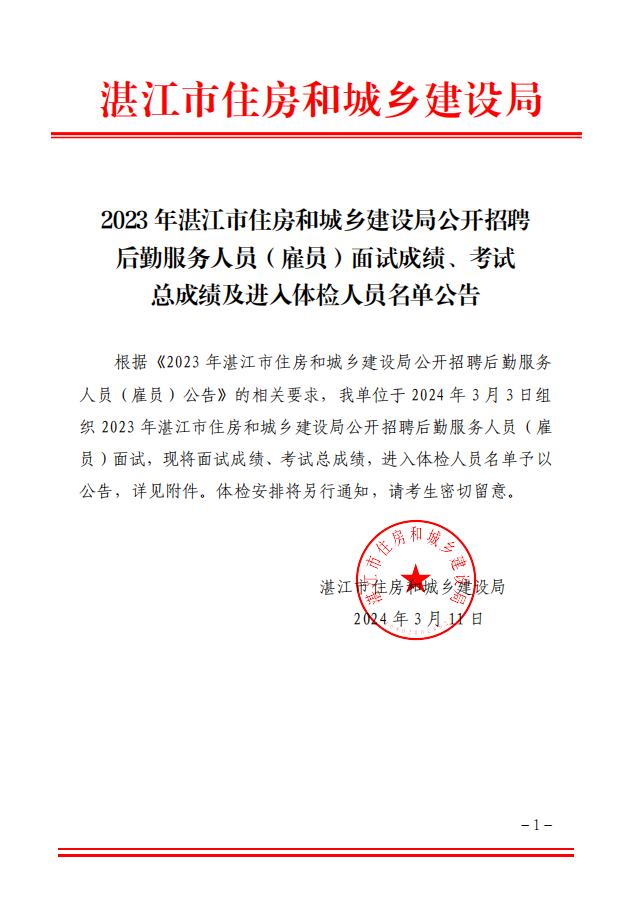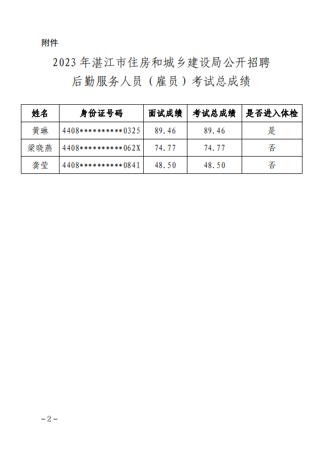 >2023年湛江市住房和城乡建设局公开招聘后勤服务人员(雇员)面试成绩、考试总成绩及进入体检人员名单公告